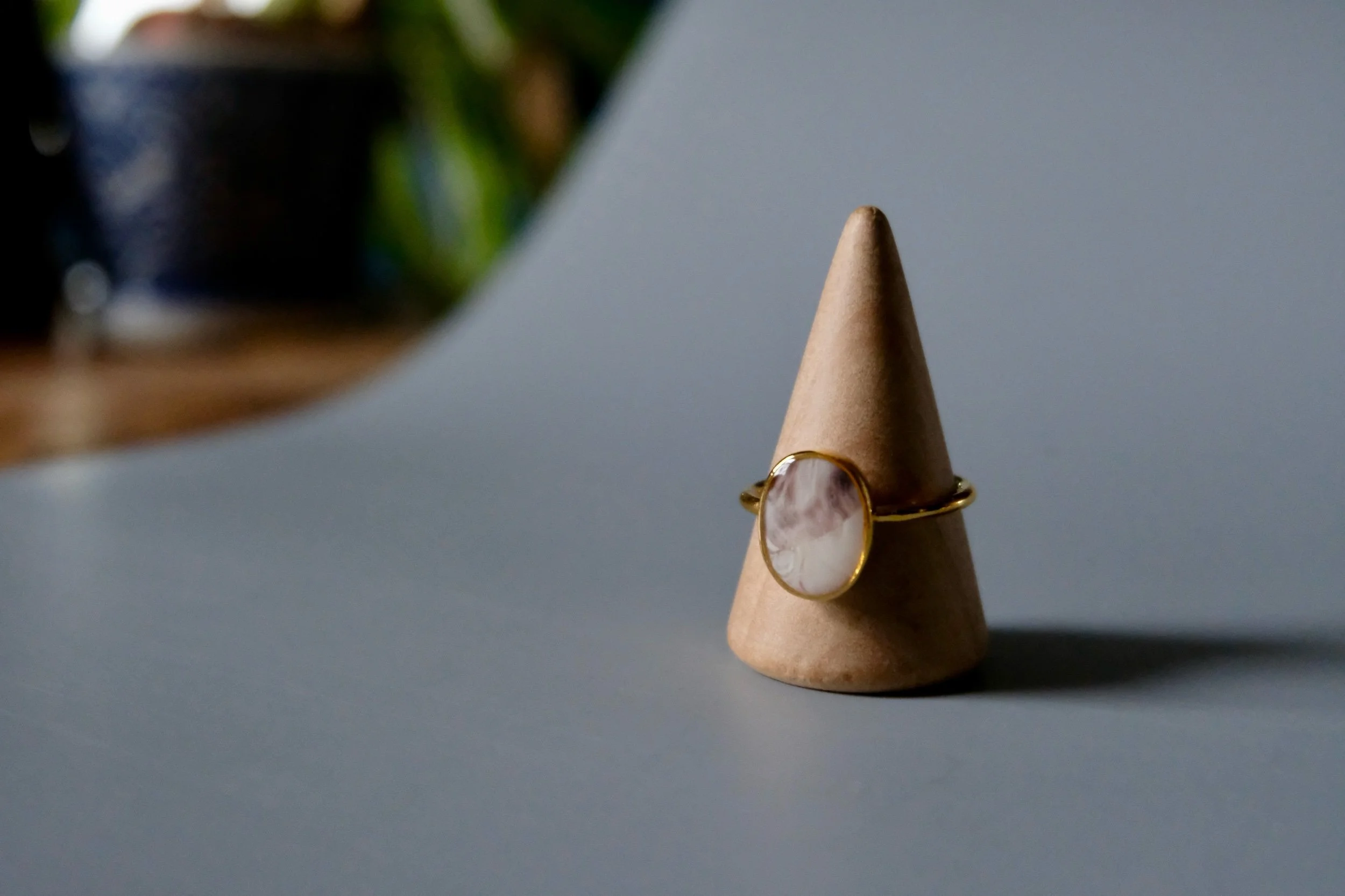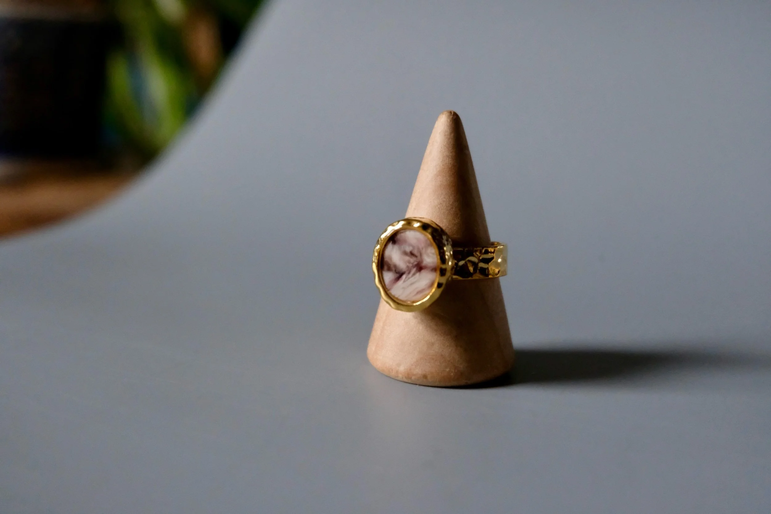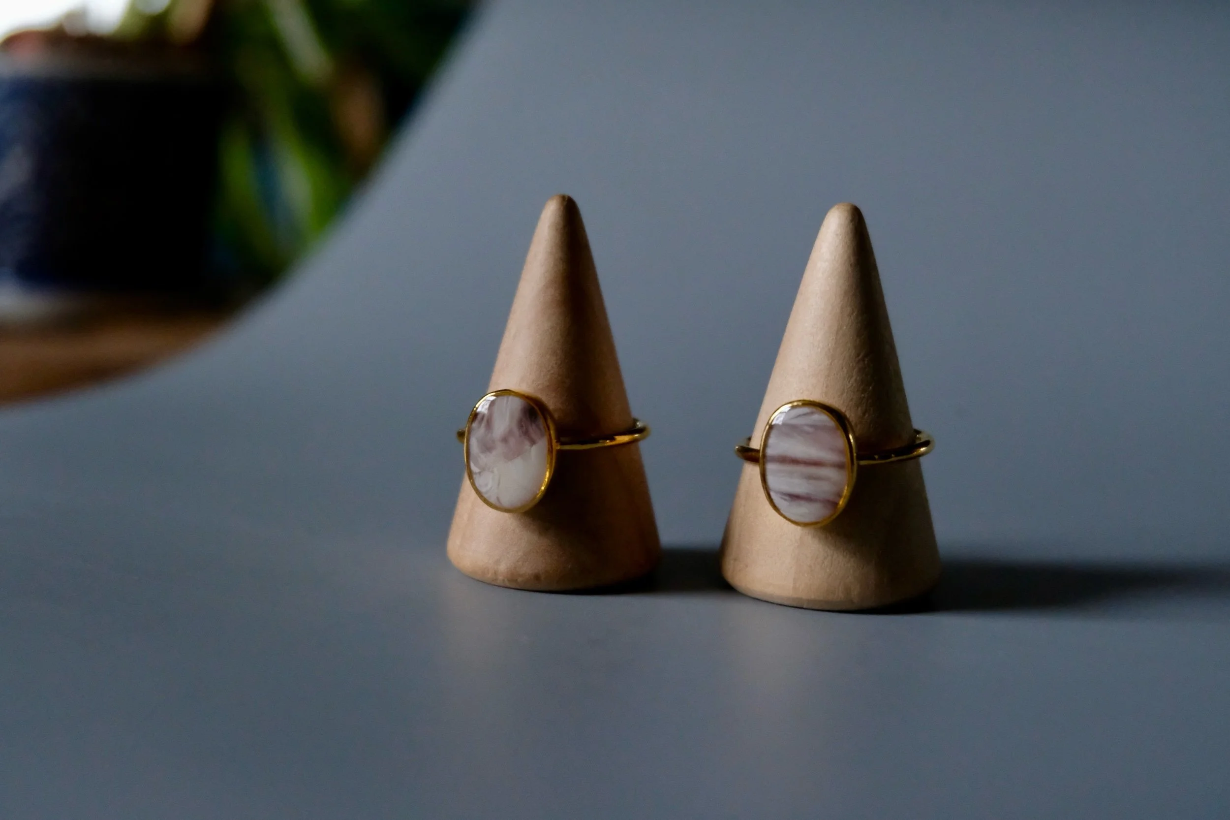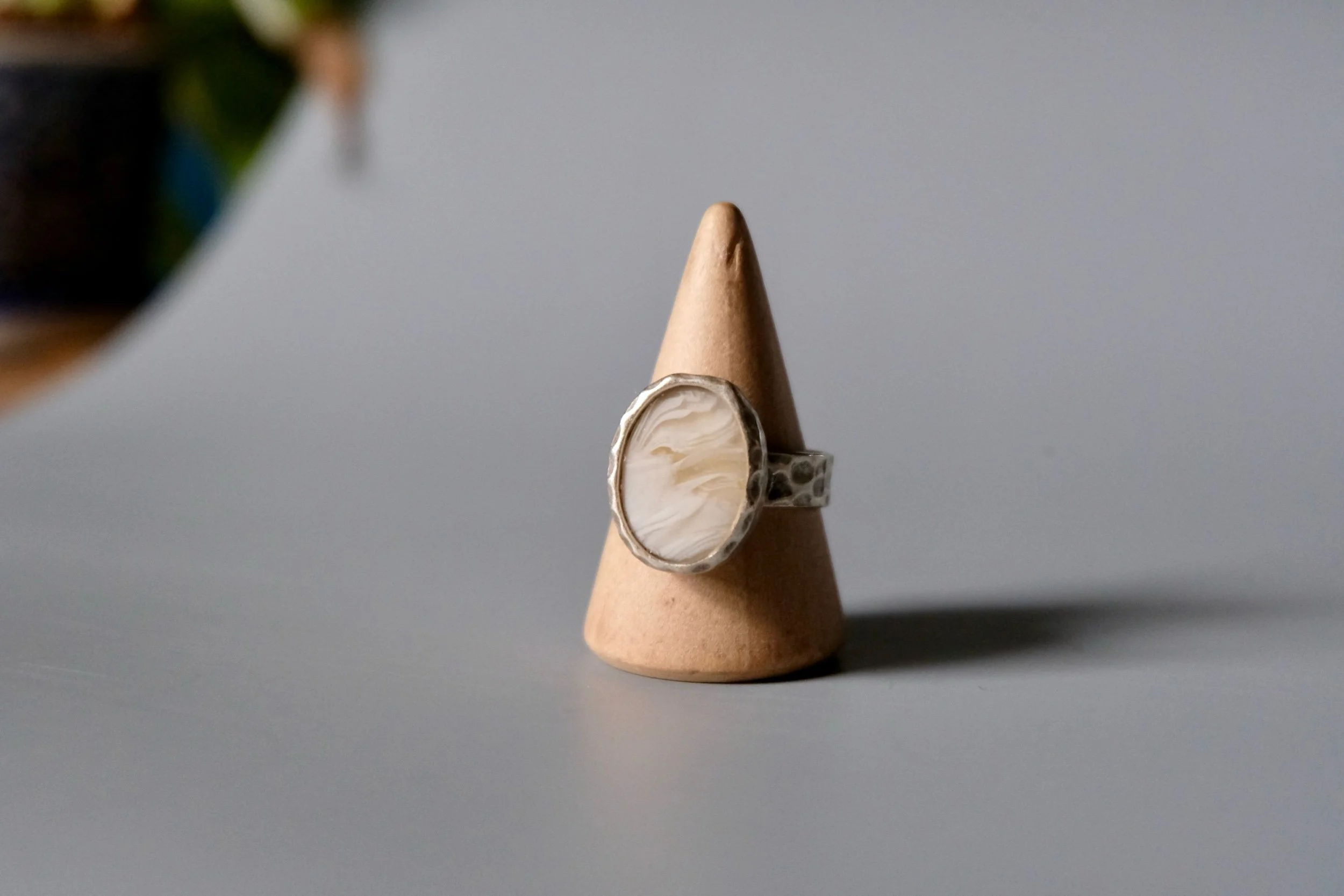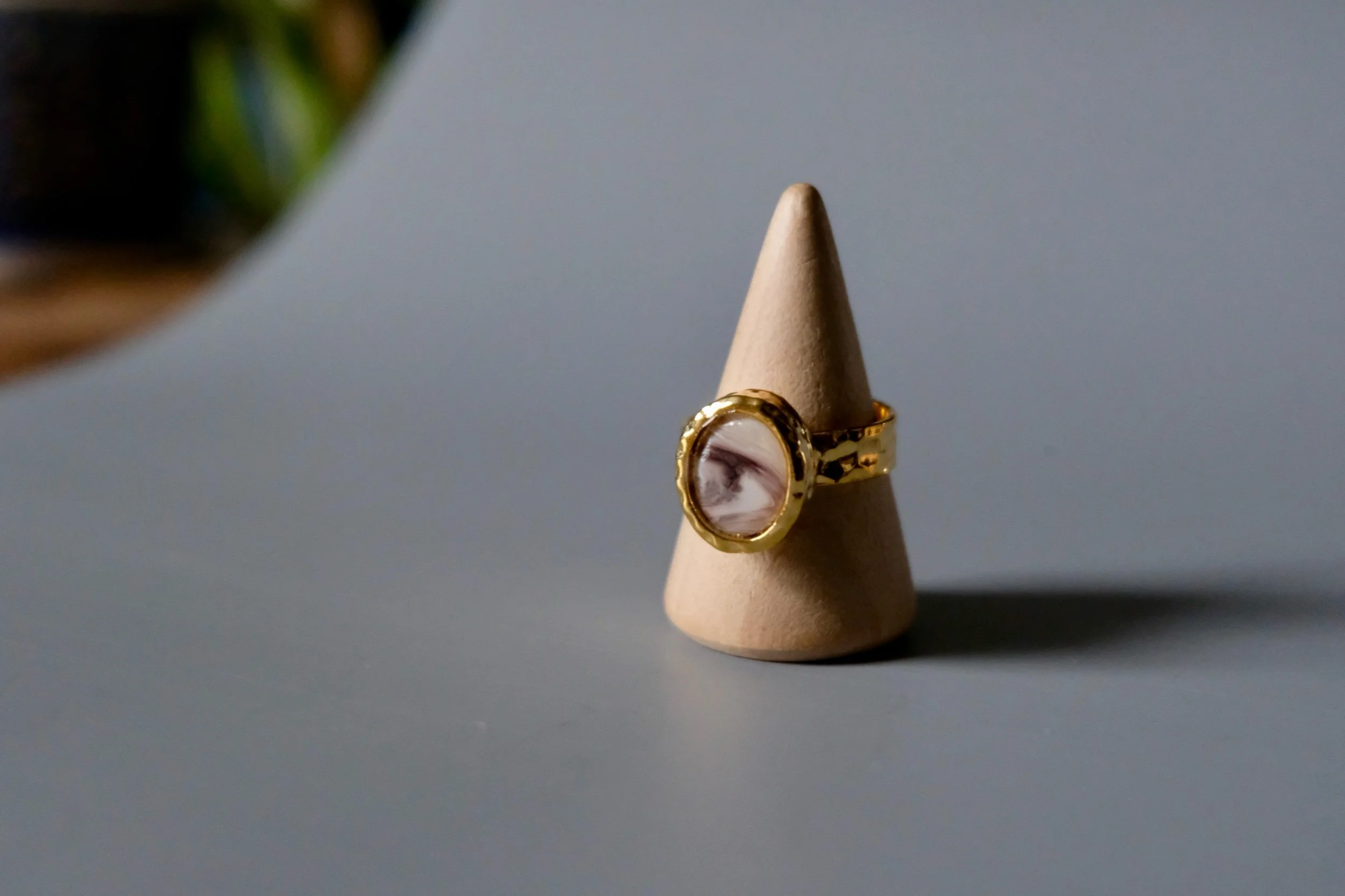 This adjustable ring features a unique polymer clay insert in an open bezel and finished with UV resin. Lightweight, durable and the adjustable band ensures a comfortable fit.