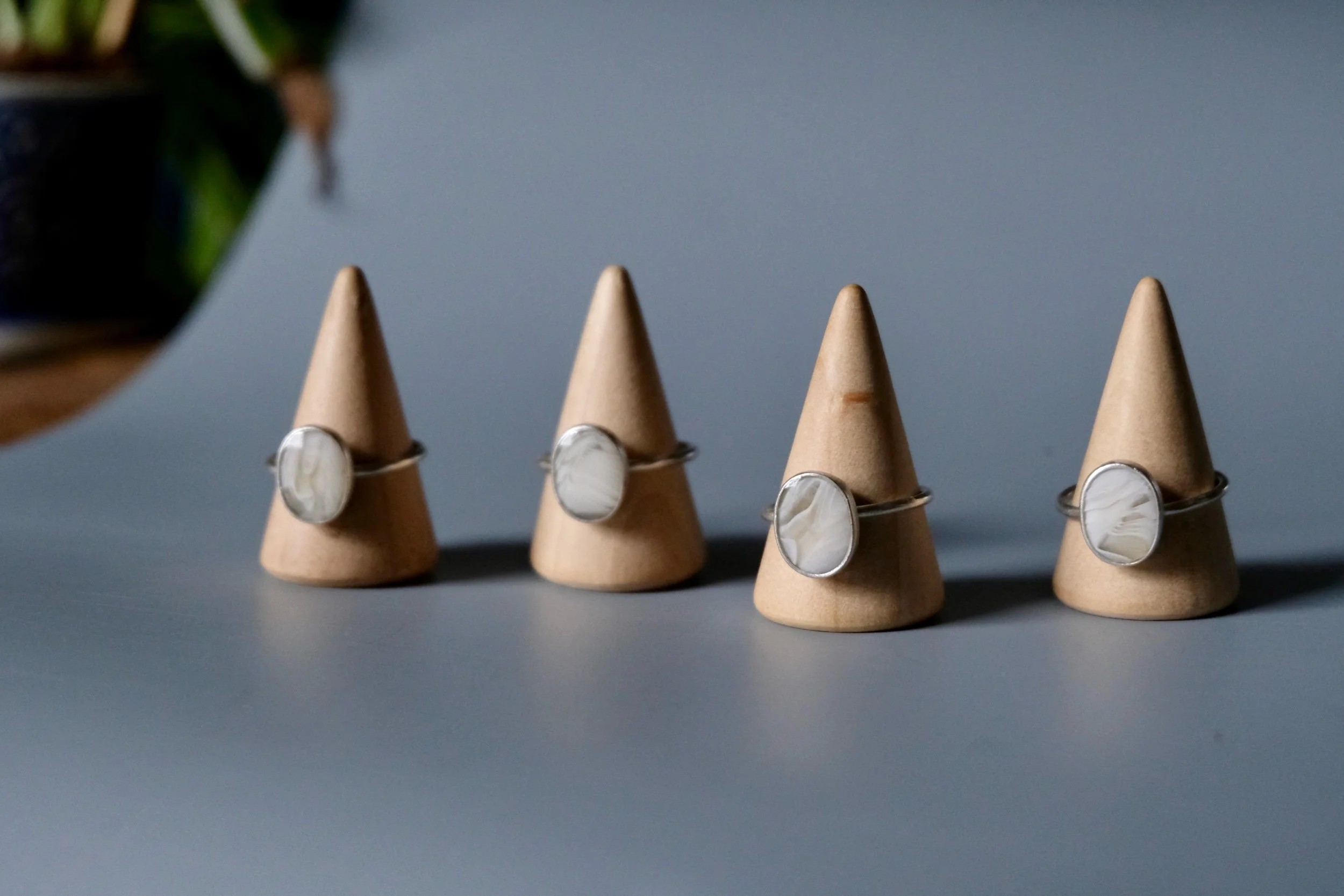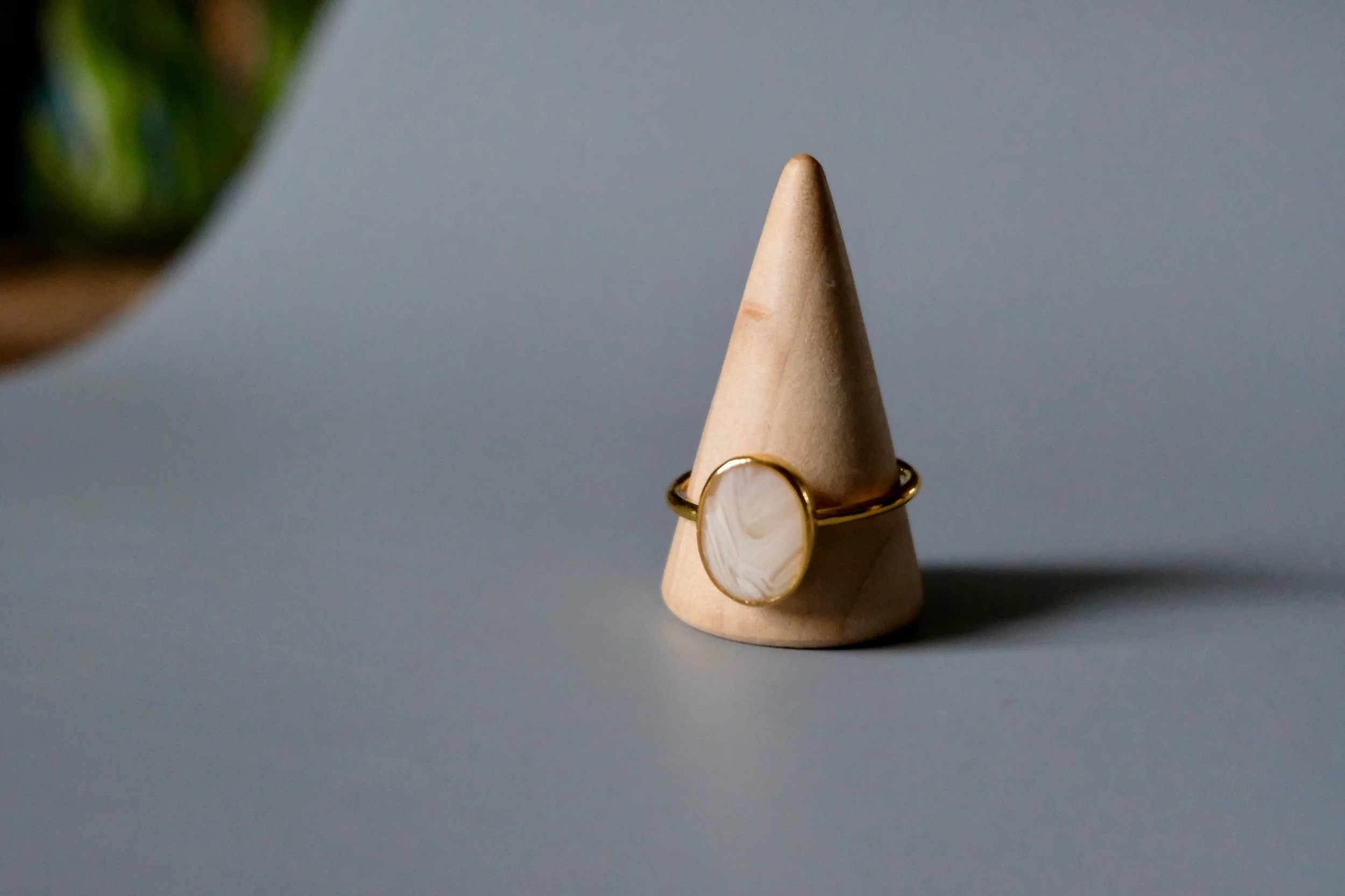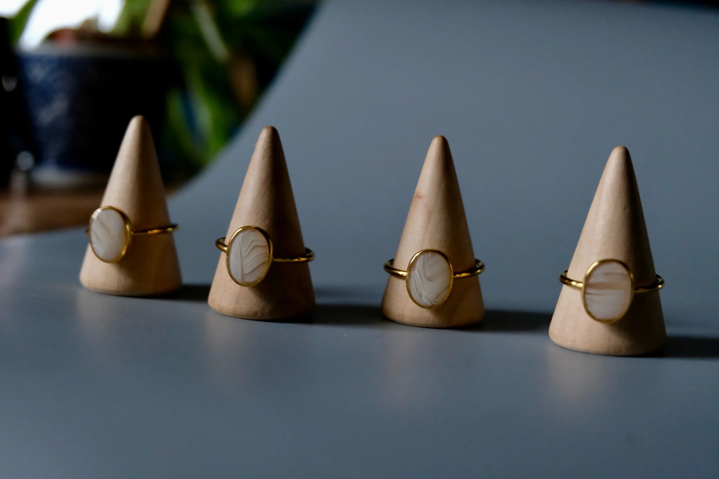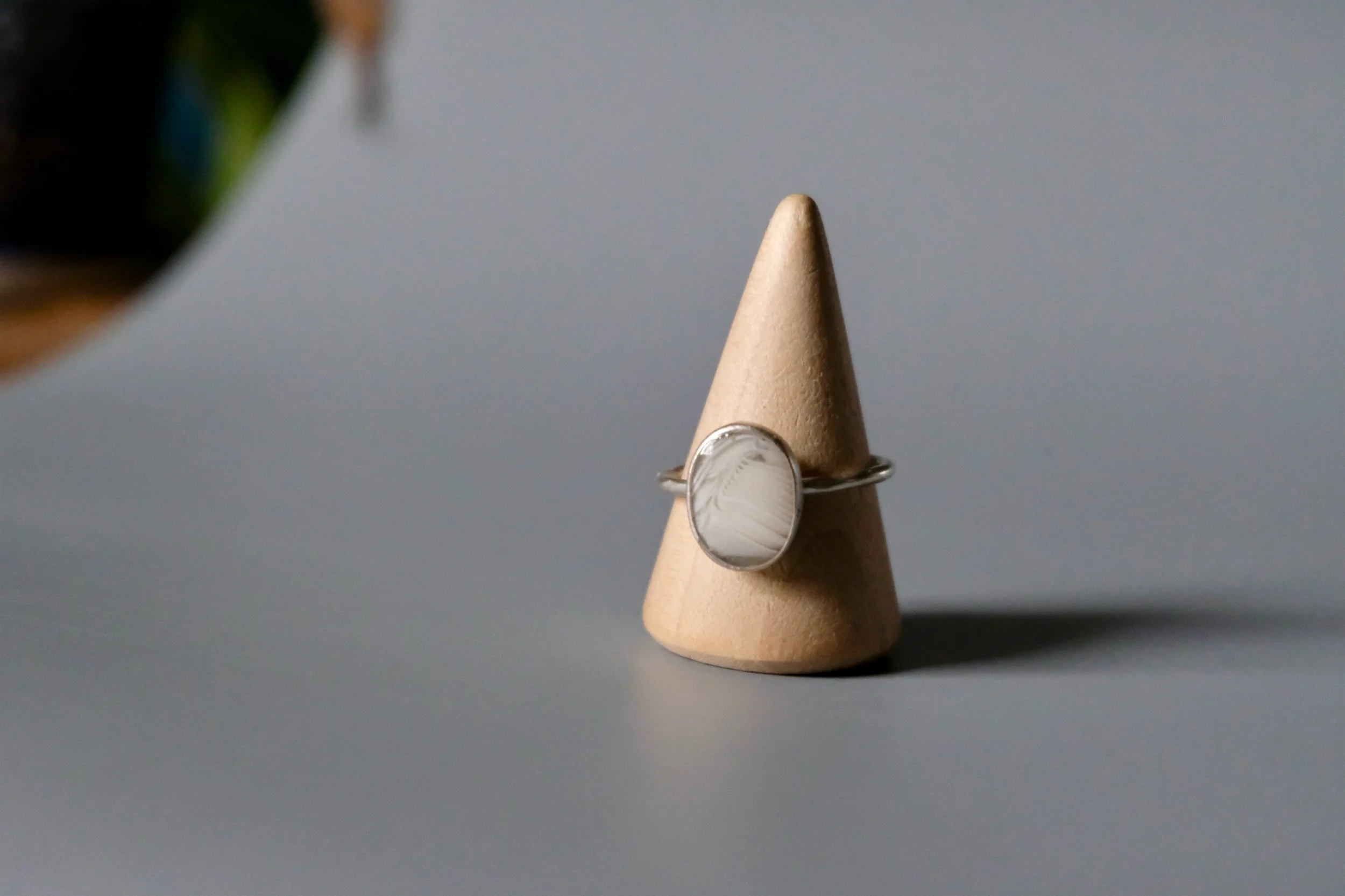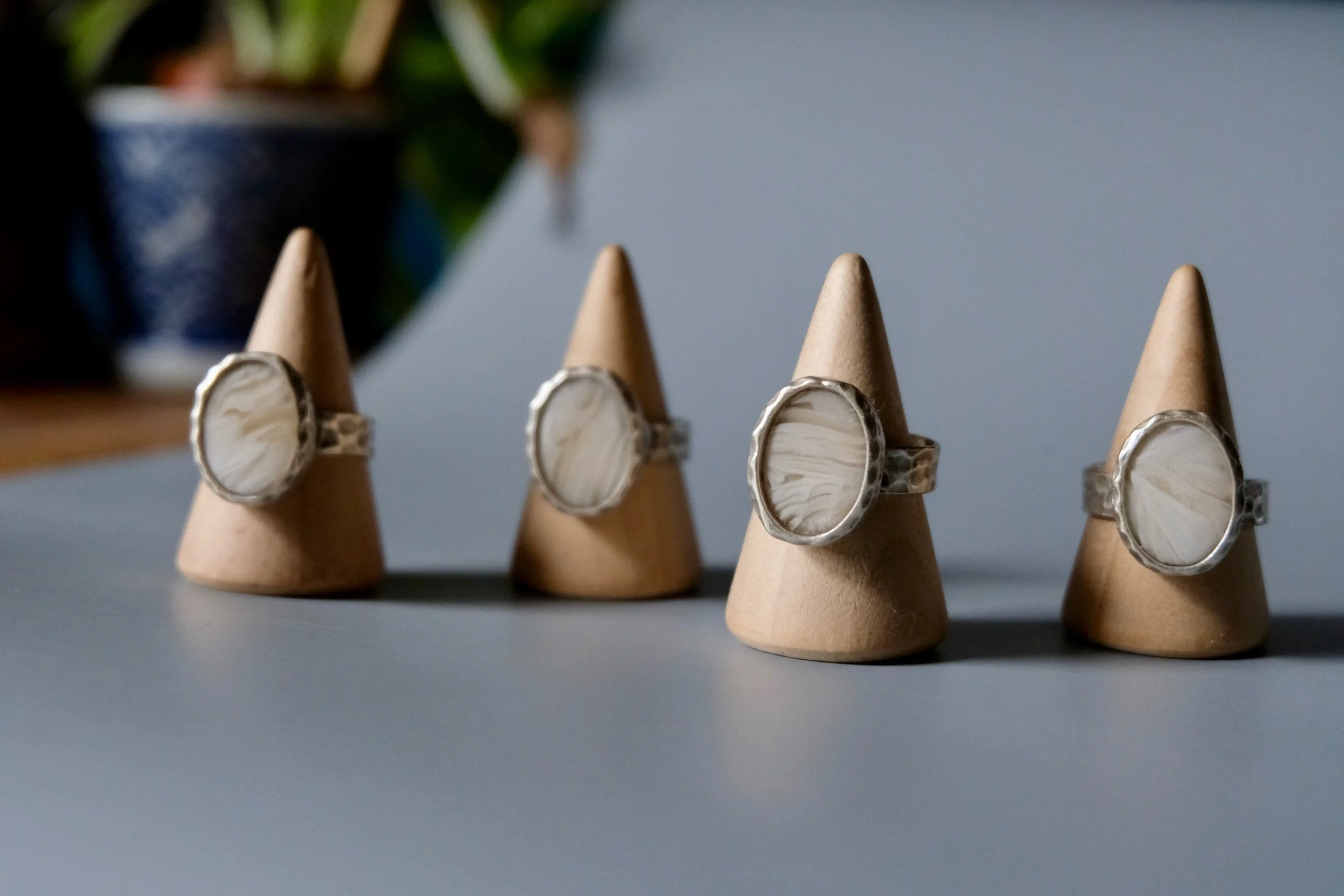 This adjustable ring features a unique polymer clay insert in an open bezel and finished with UV resin. Lightweight, durable and the adjustable band ensures a comfortable fit.