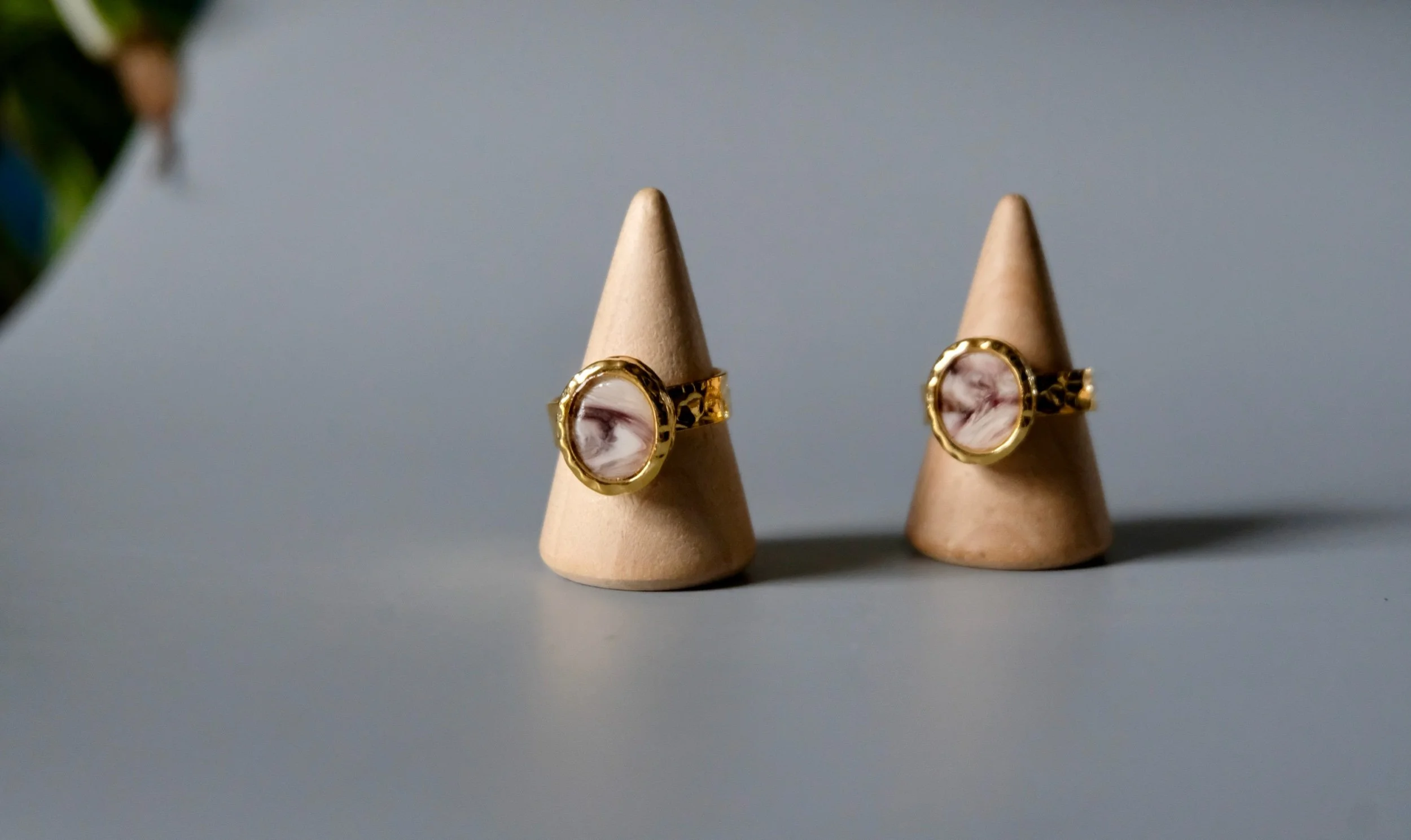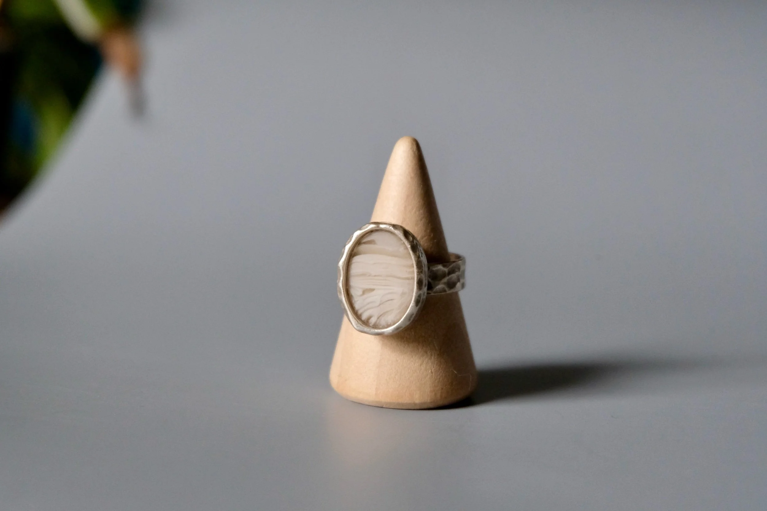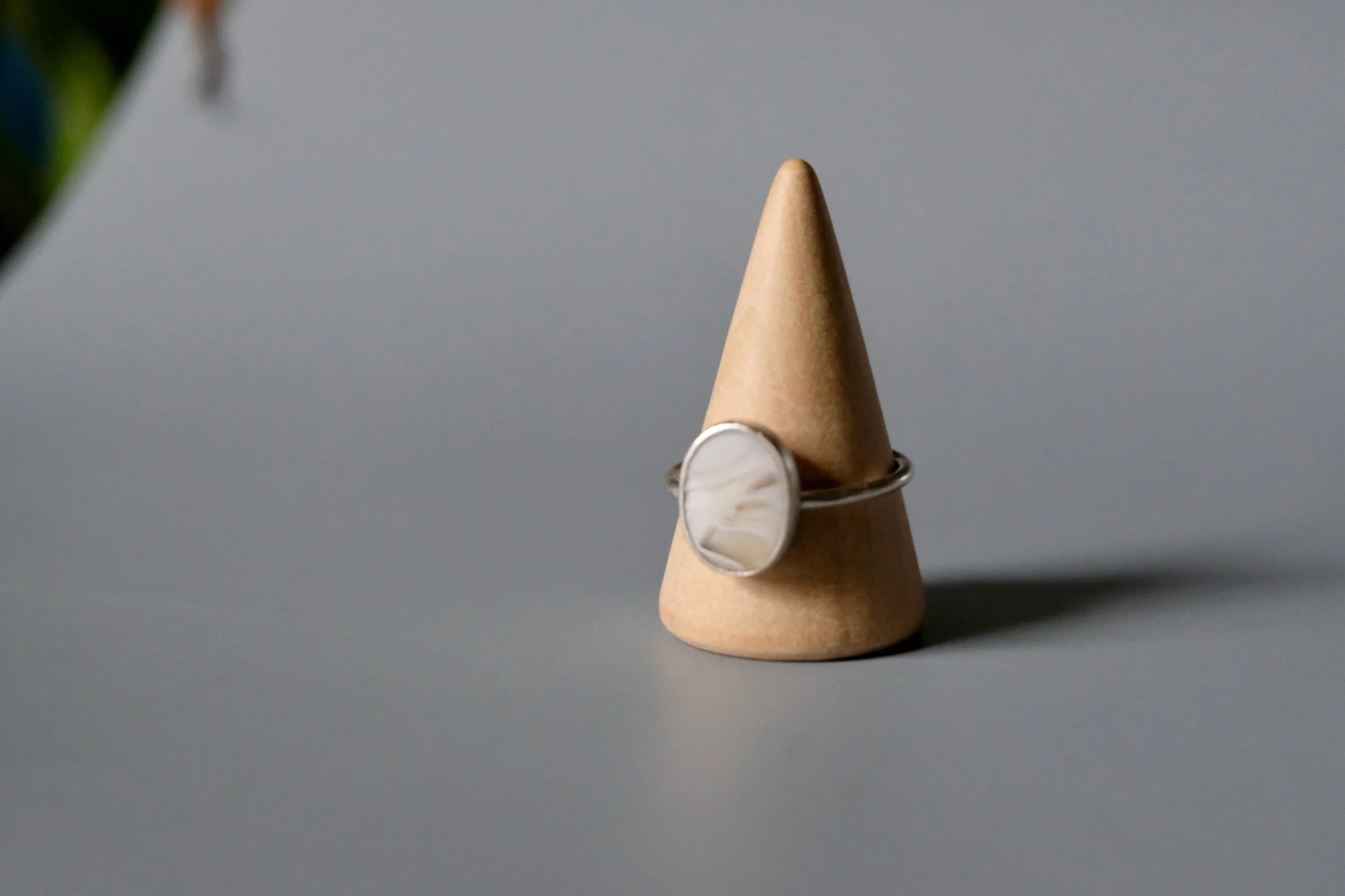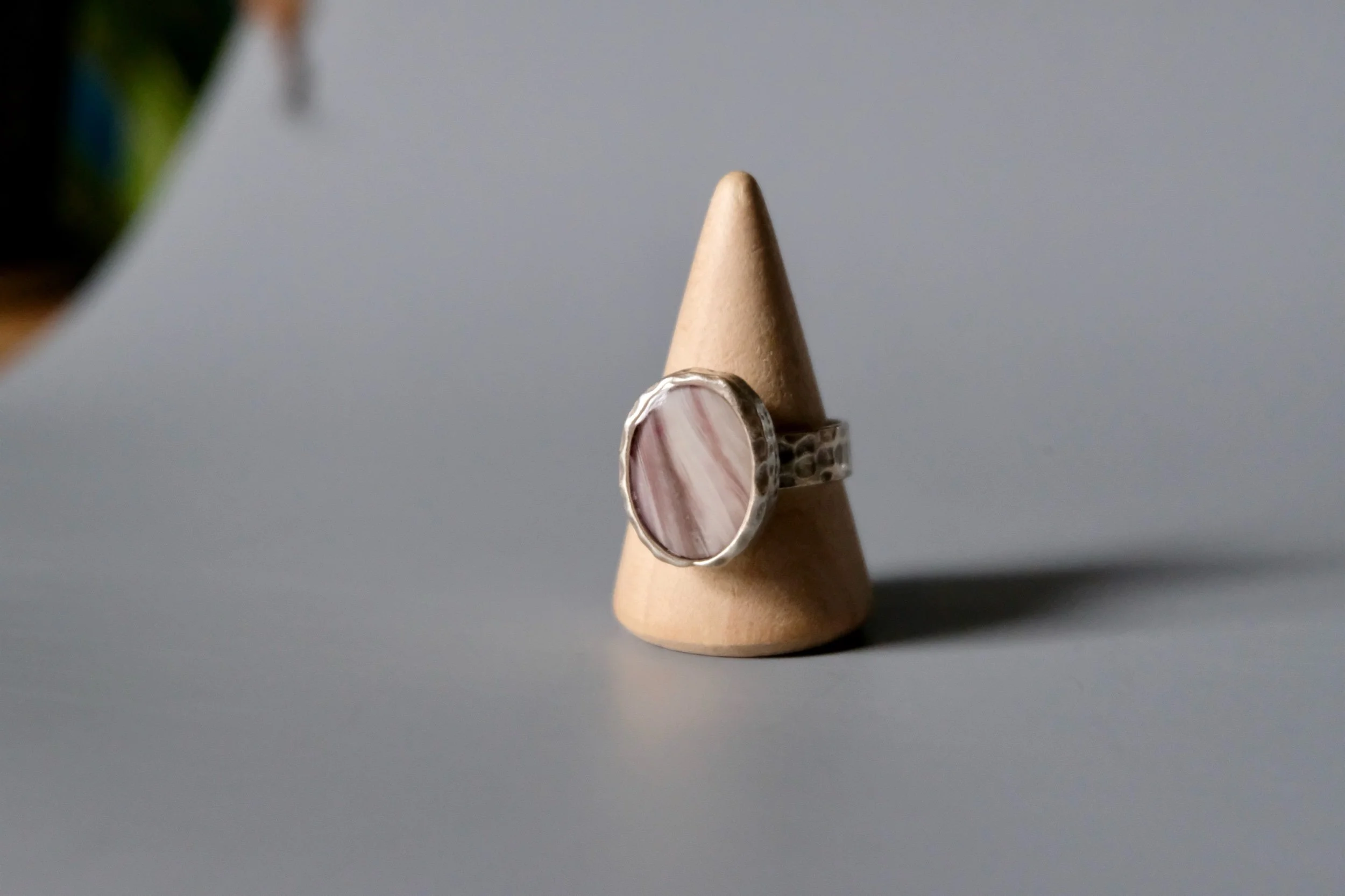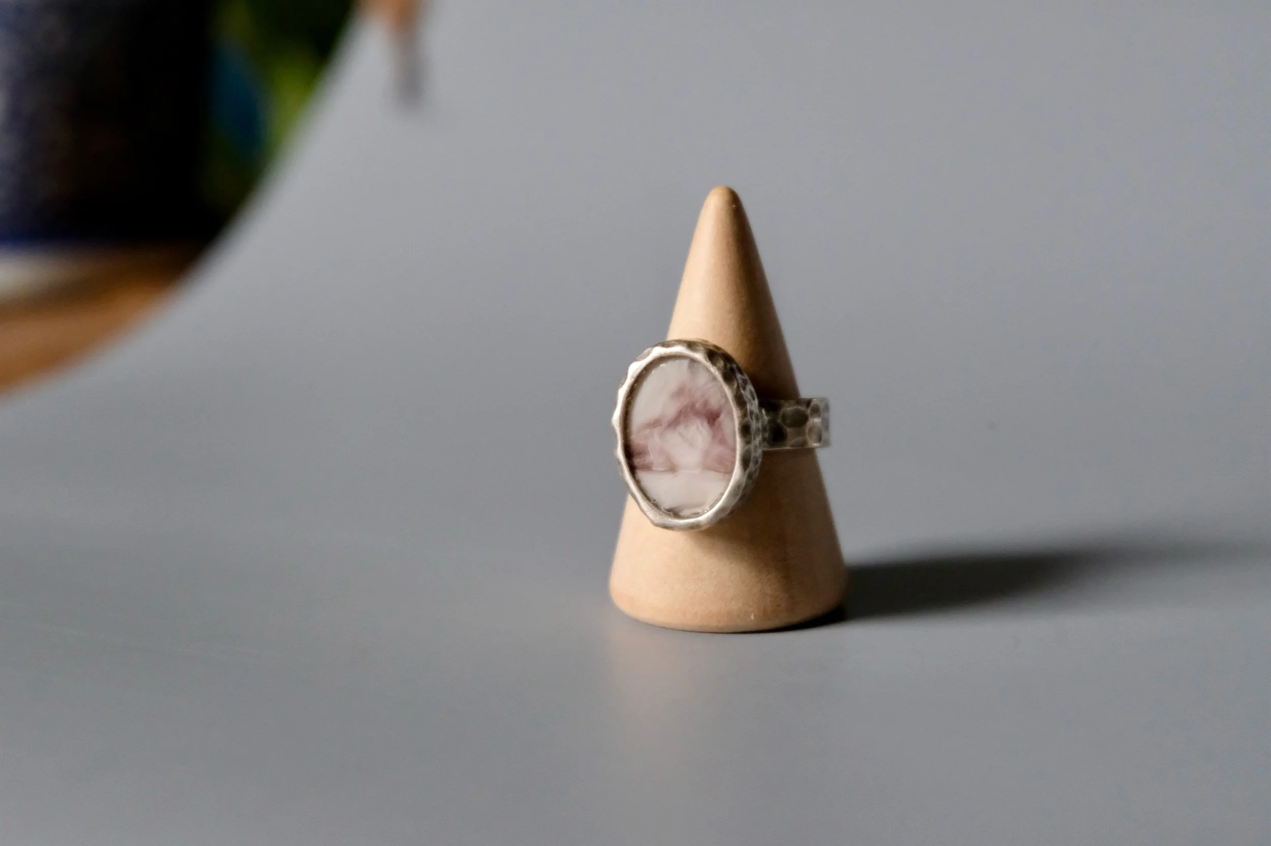 This adjustable ring features a unique polymer clay insert in an open bezel and finished with UV resin. Lightweight, durable and the adjustable band ensures a comfortable fit.