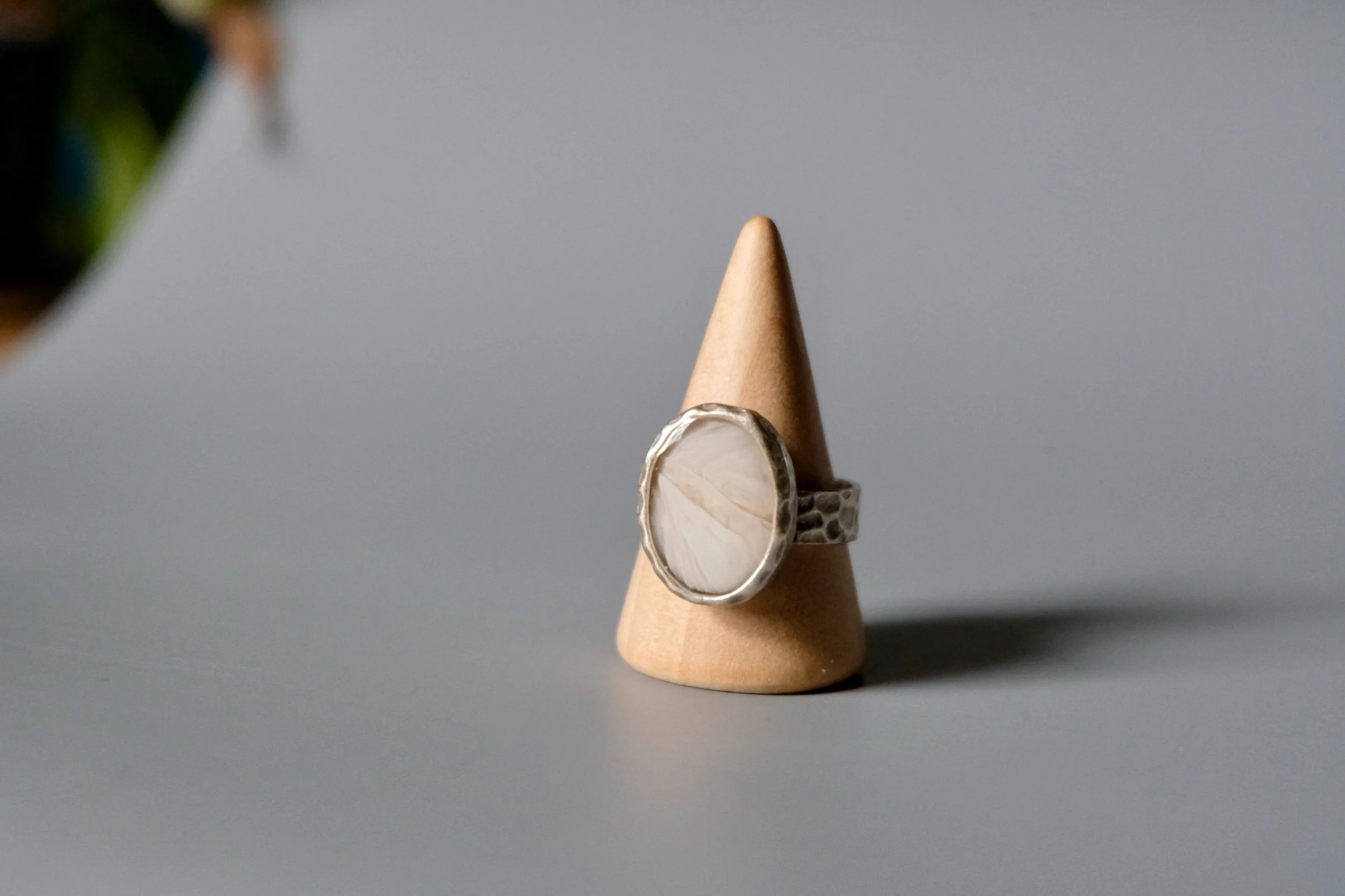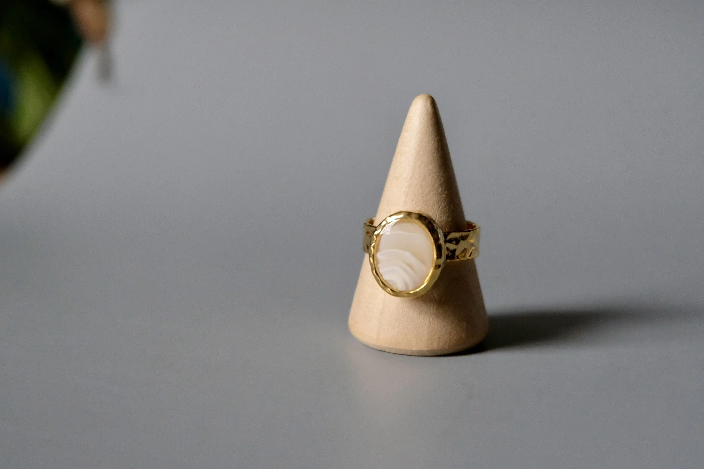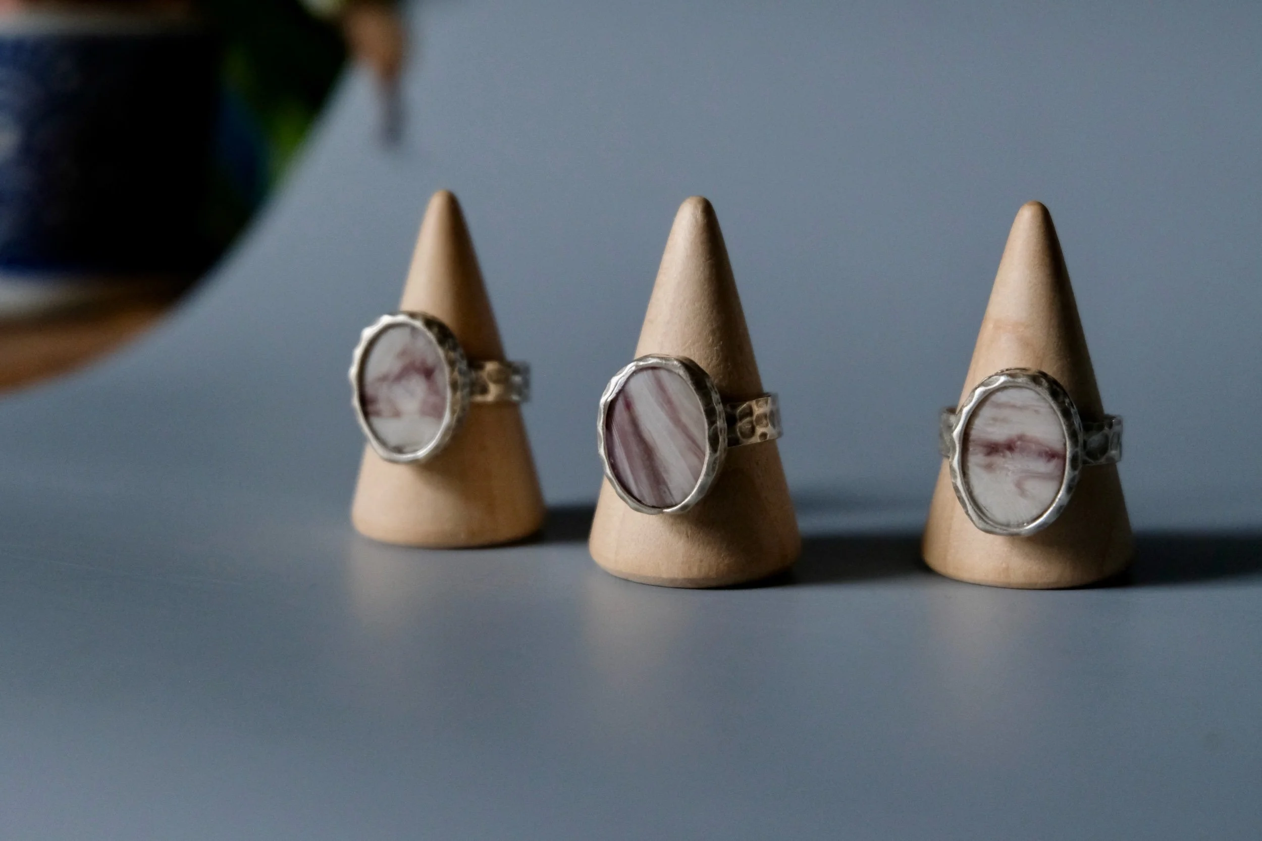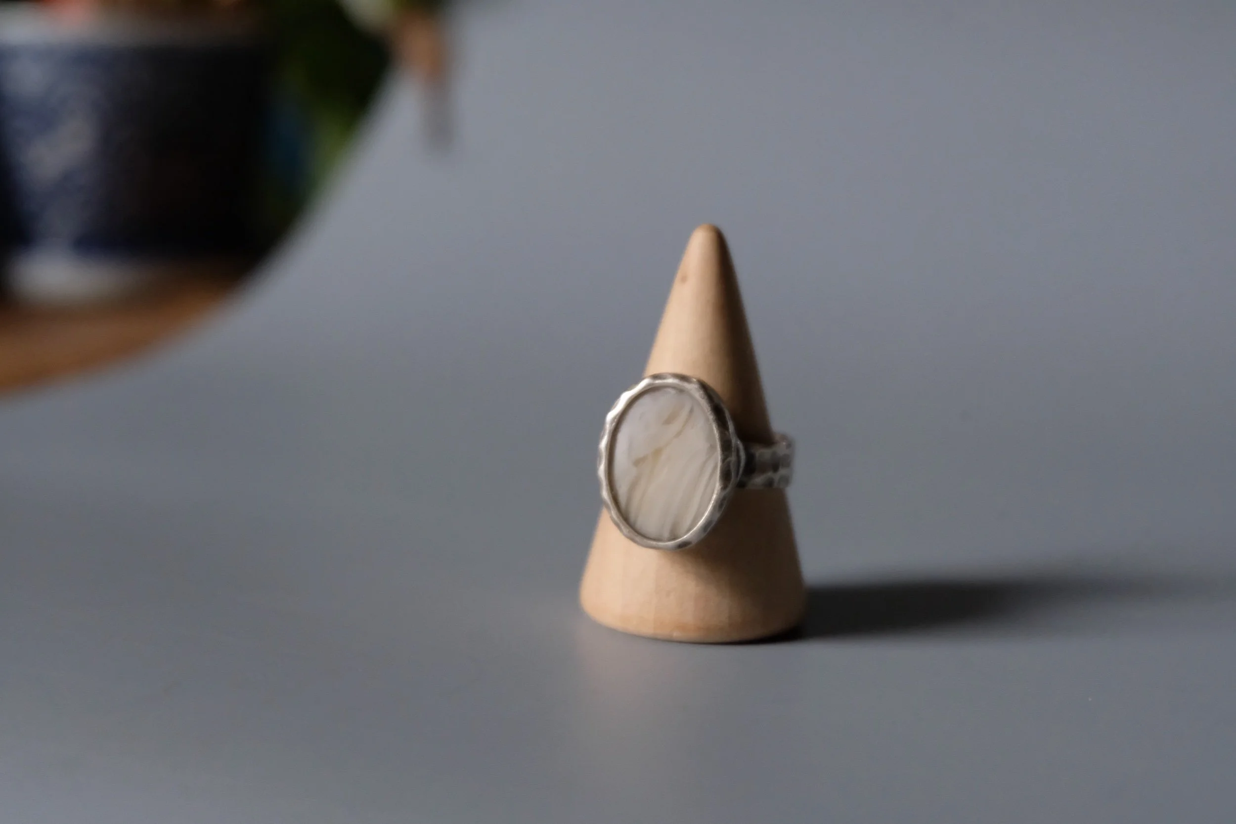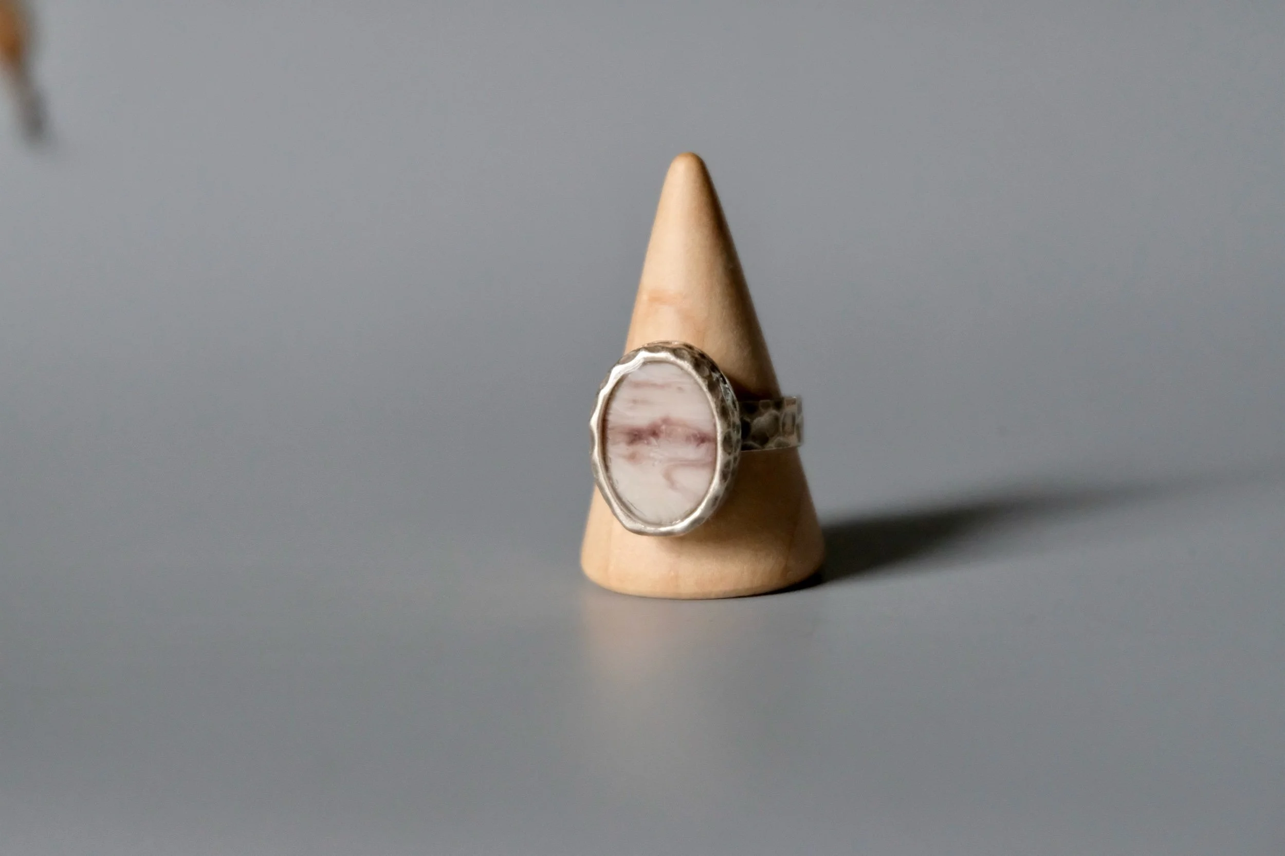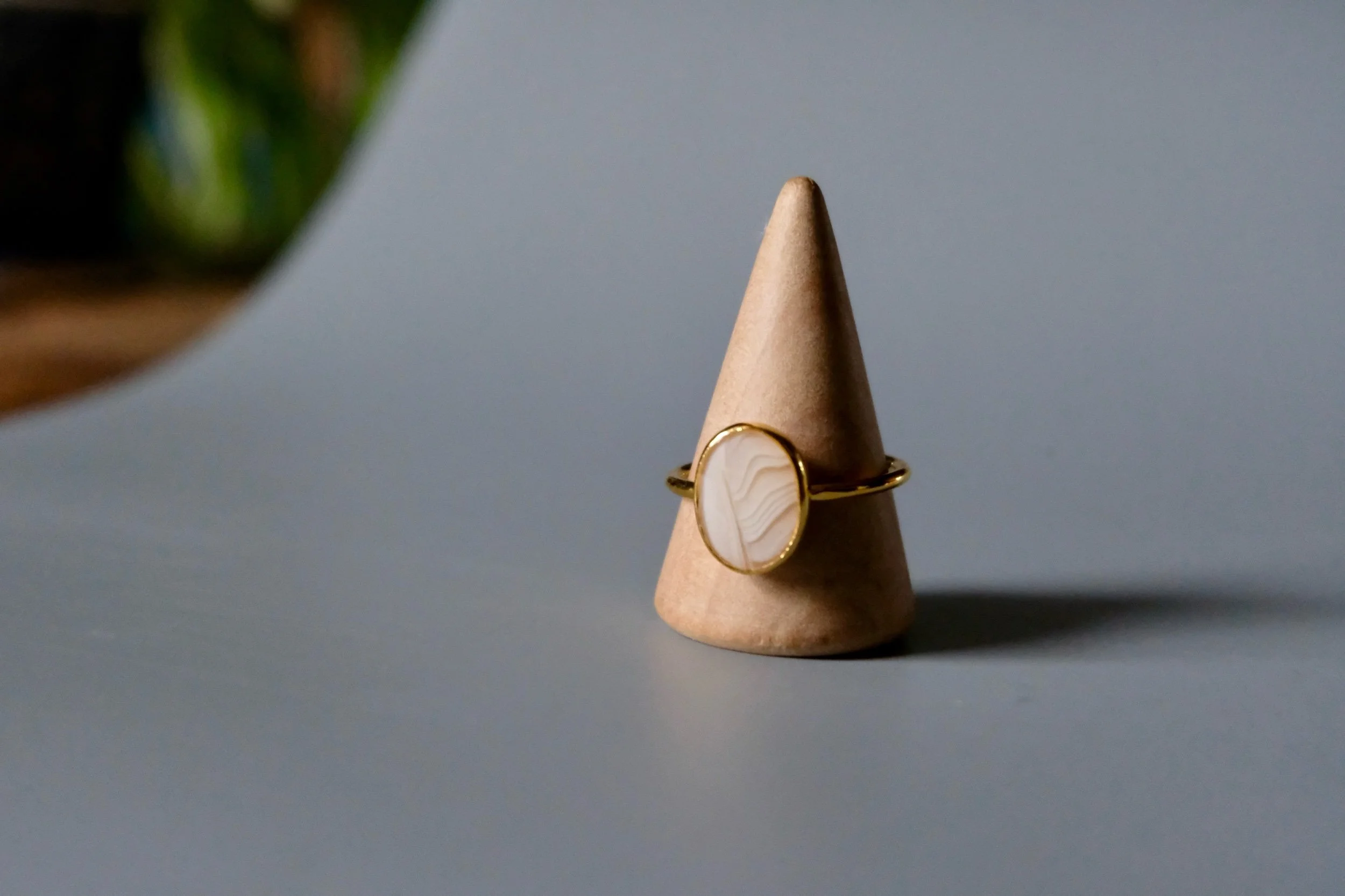 This adjustable ring features a unique polymer clay insert in an open bezel and finished with UV resin. Lightweight, durable and the adjustable band ensures a comfortable fit.