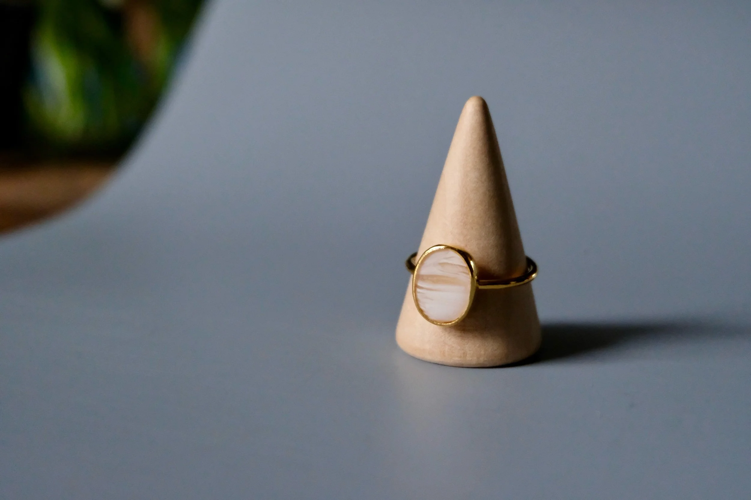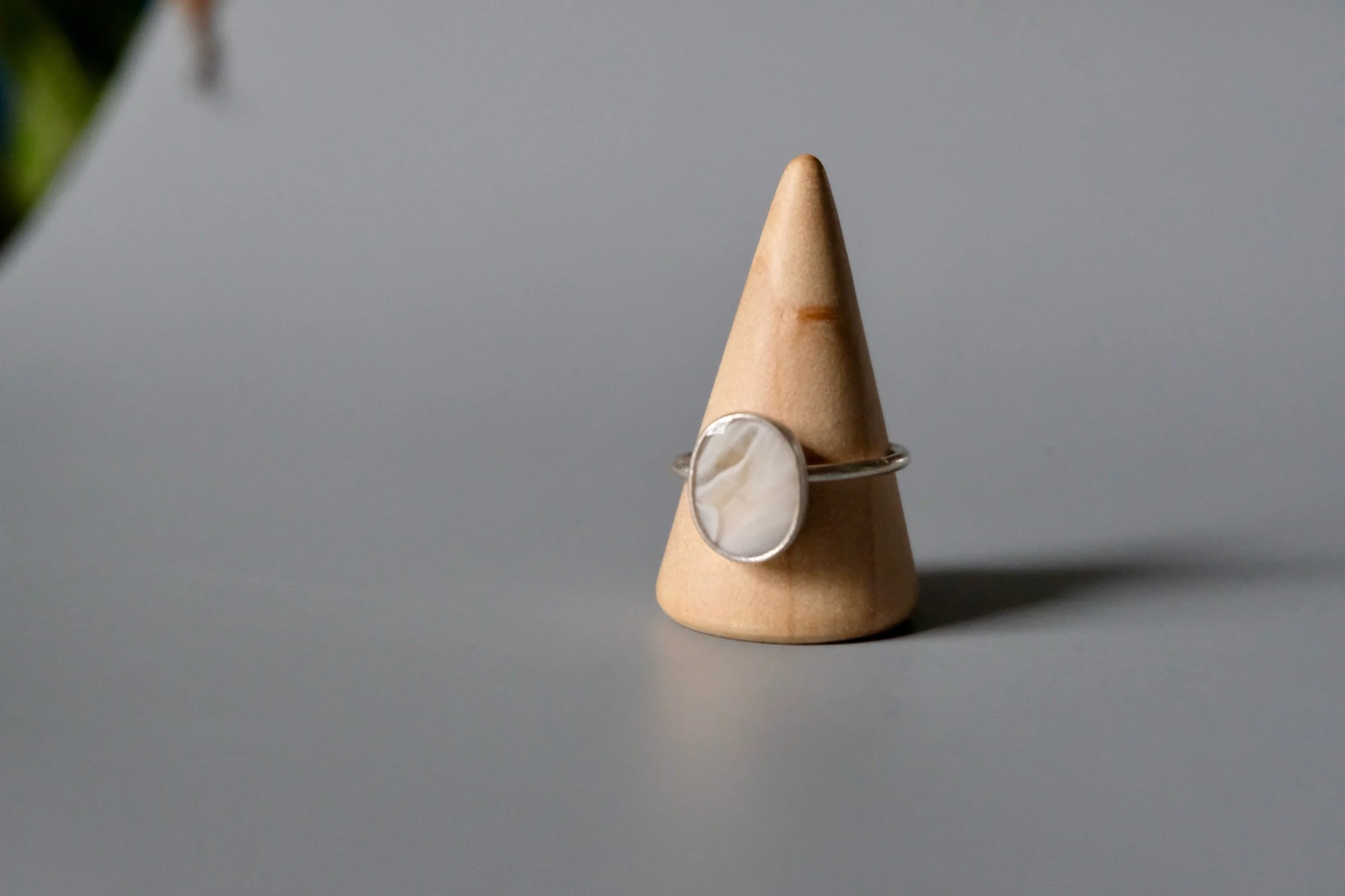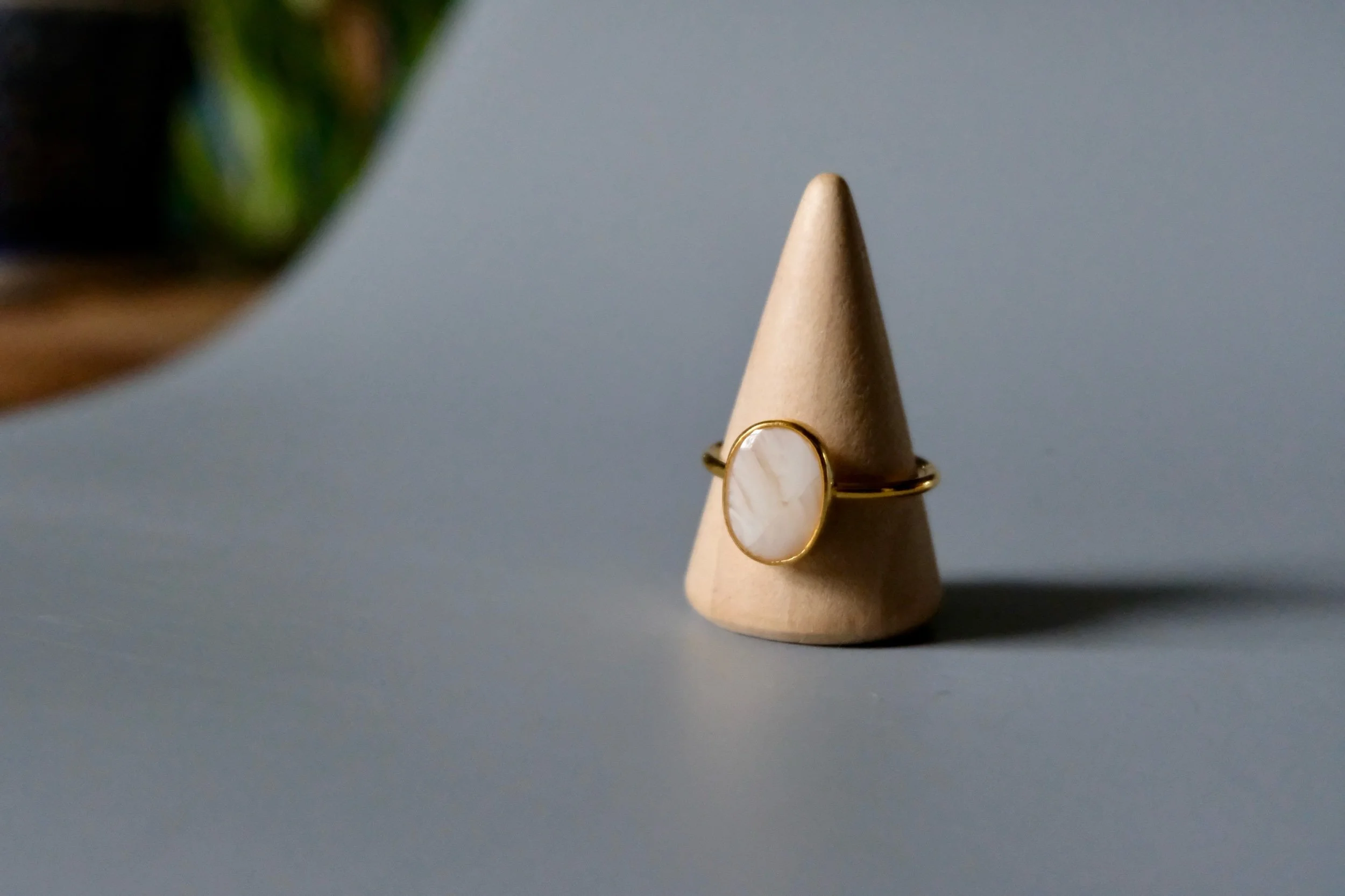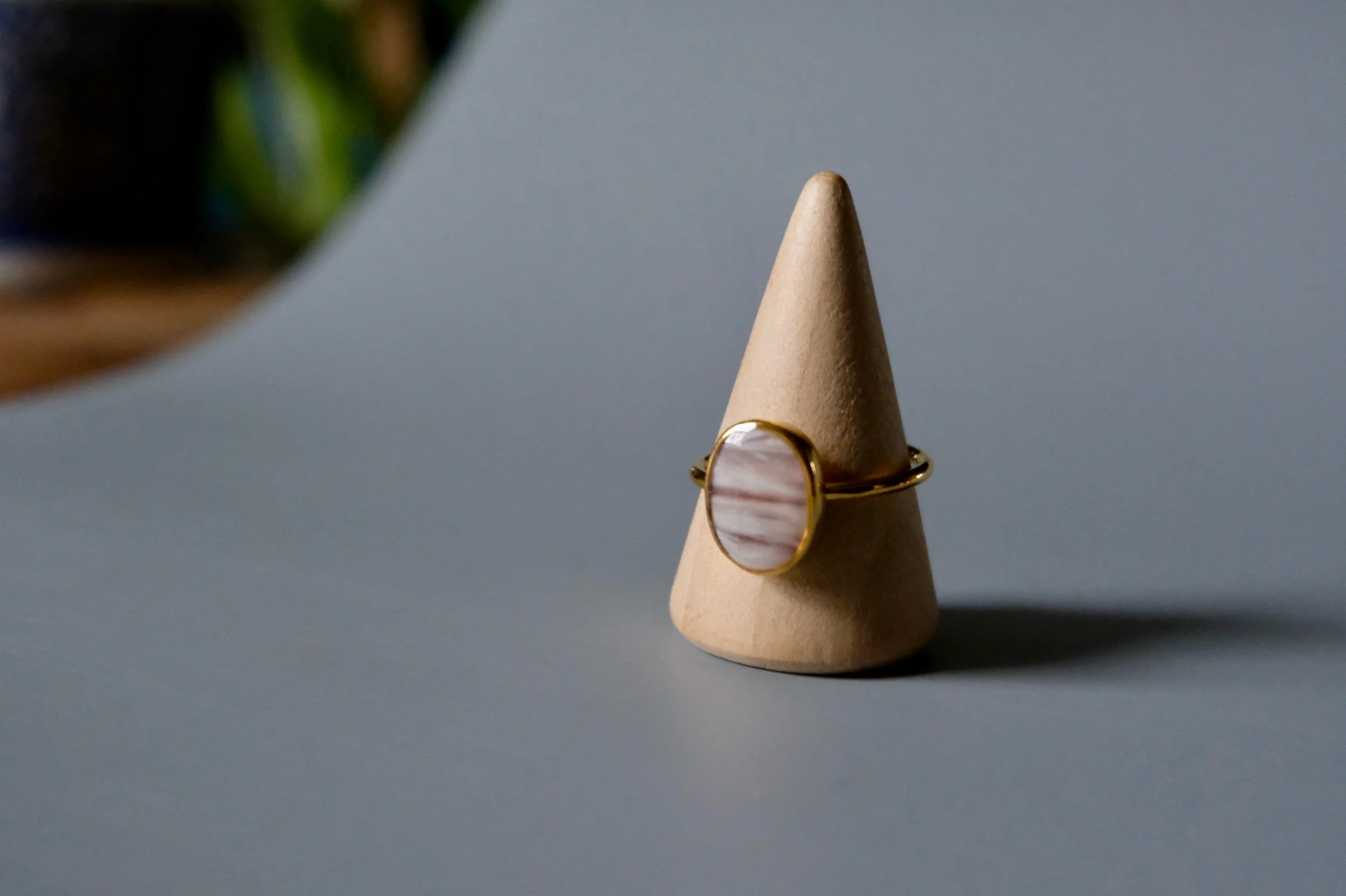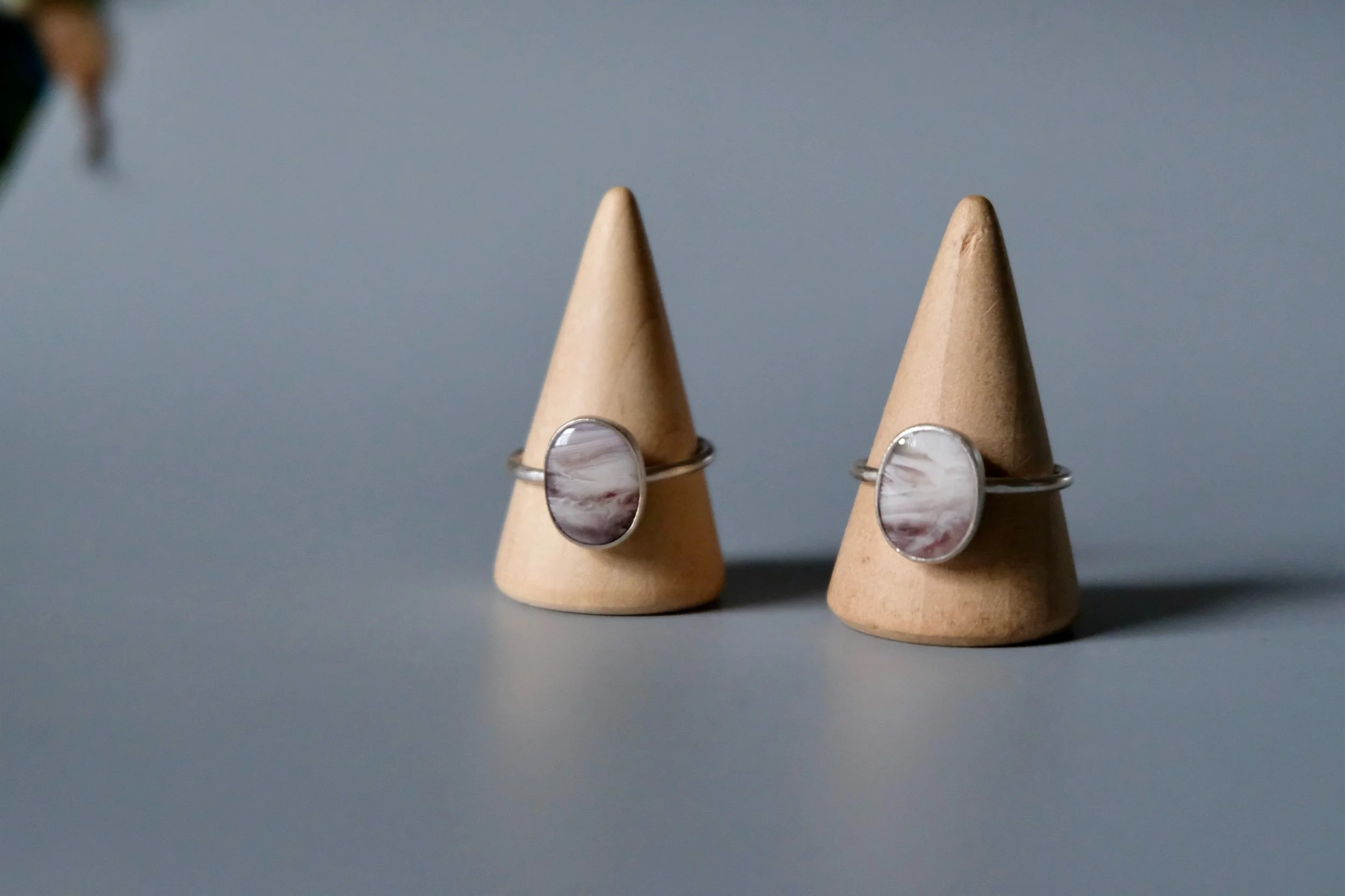 This adjustable ring features a unique polymer clay insert in an open bezel and finished with UV resin. Lightweight, durable and the adjustable band ensures a comfortable fit.