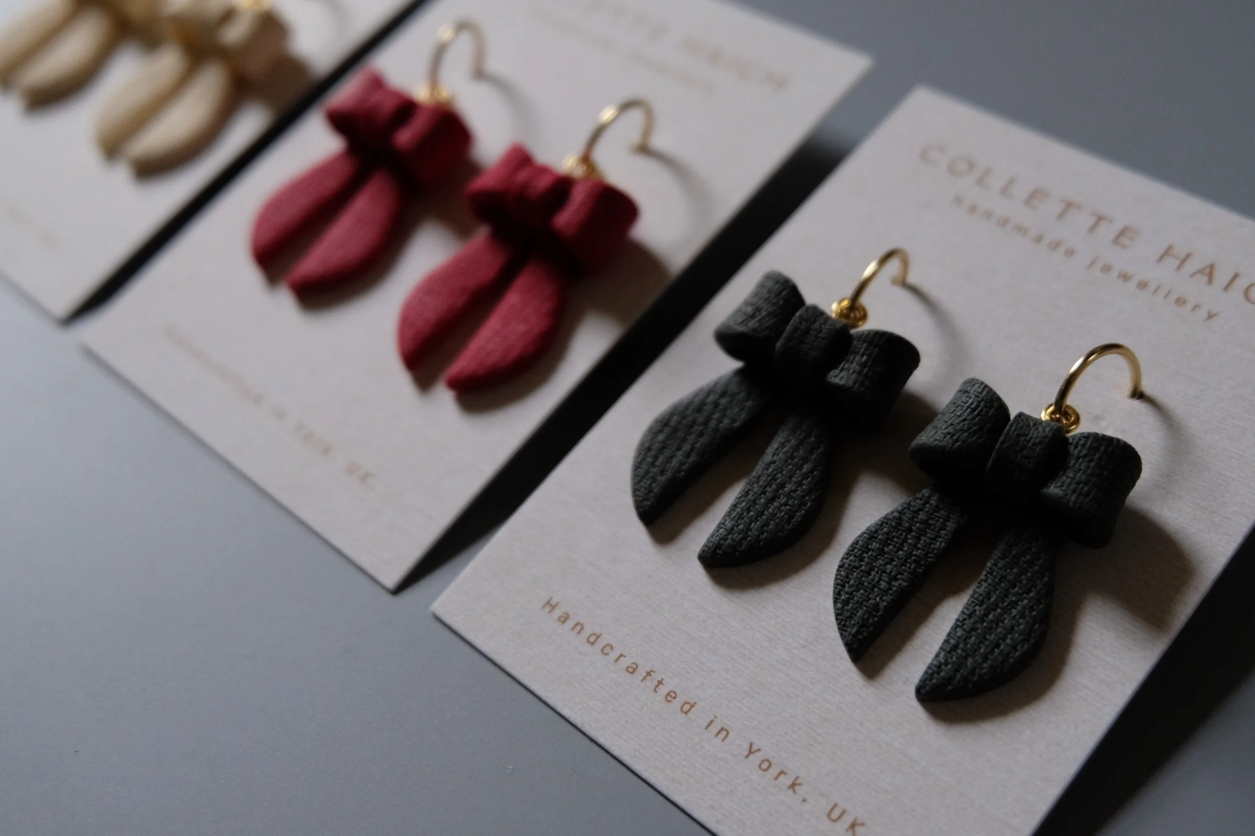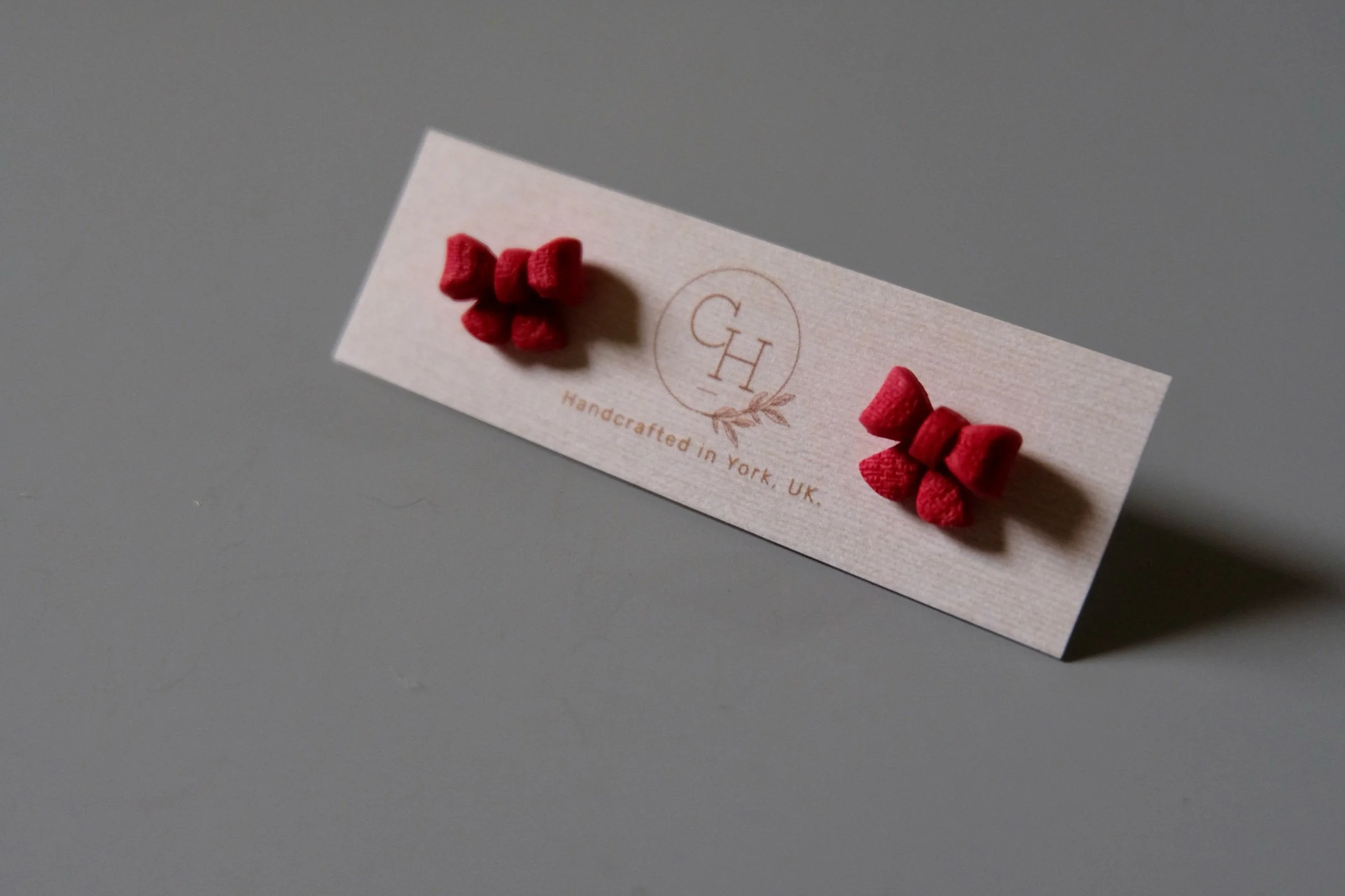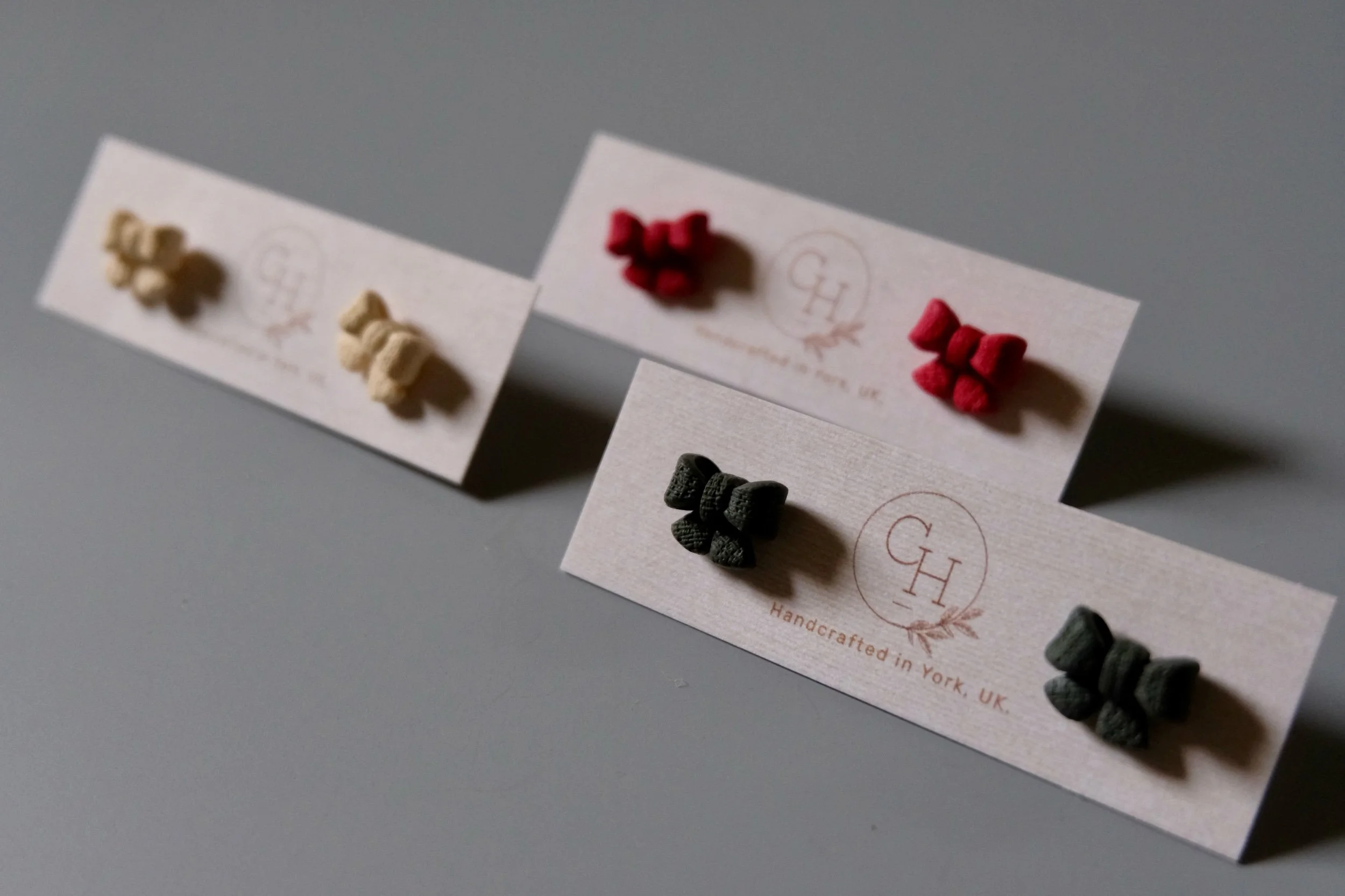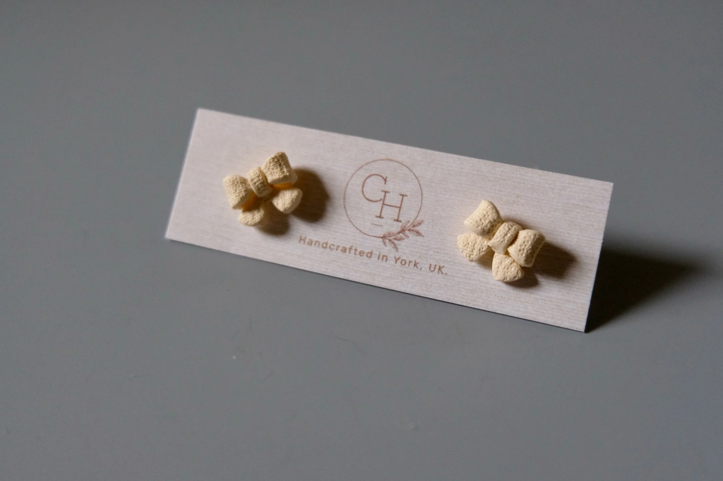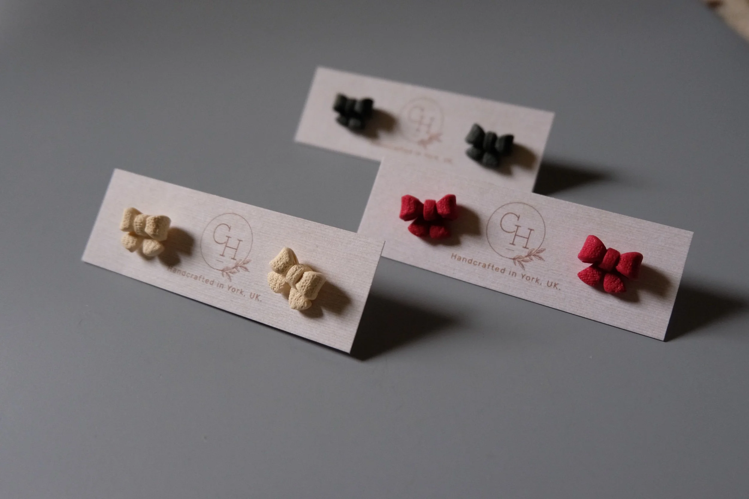 Each pair is made from polymer clay, ensuring durability and comfort for everyday wear. The bows are delicately shaped and securely attached via a ballpoint hoop, making them easy to wear.