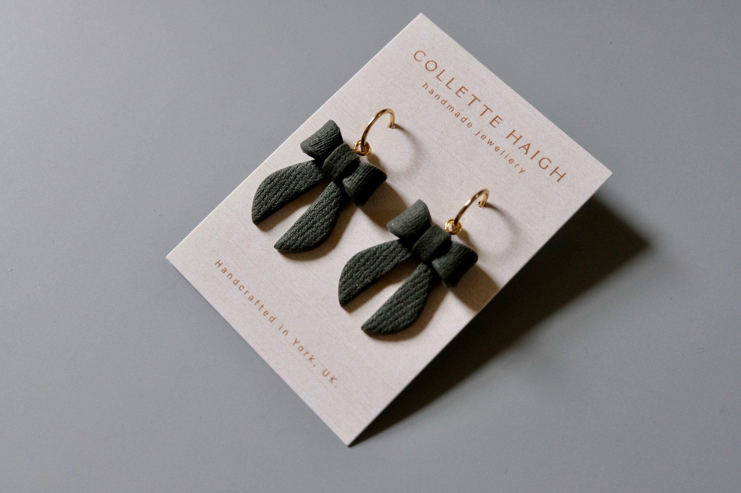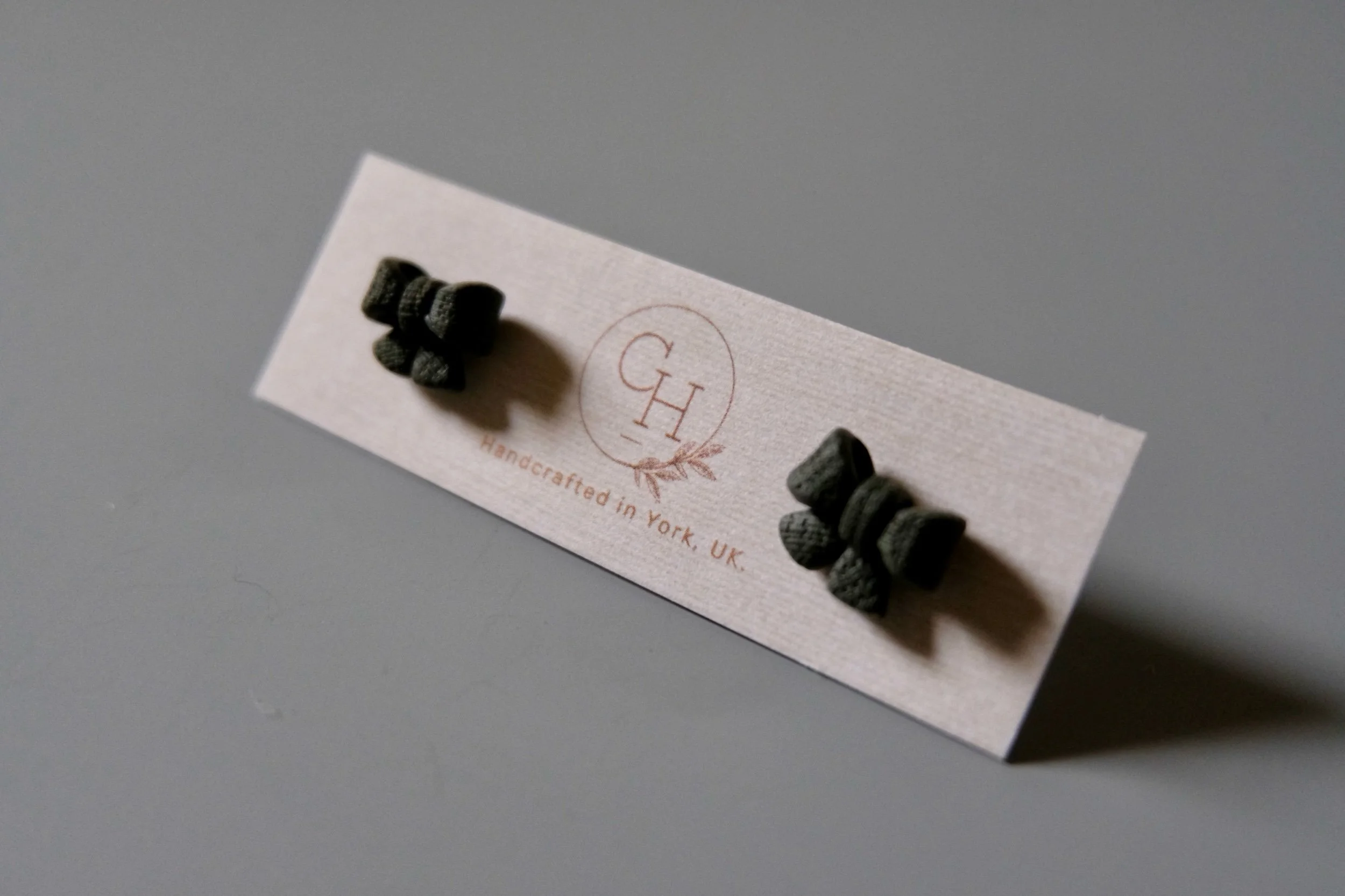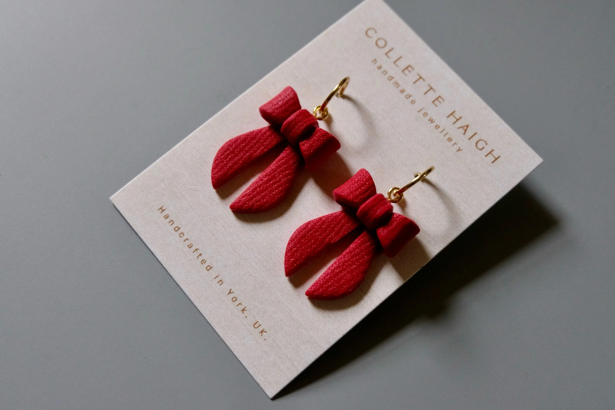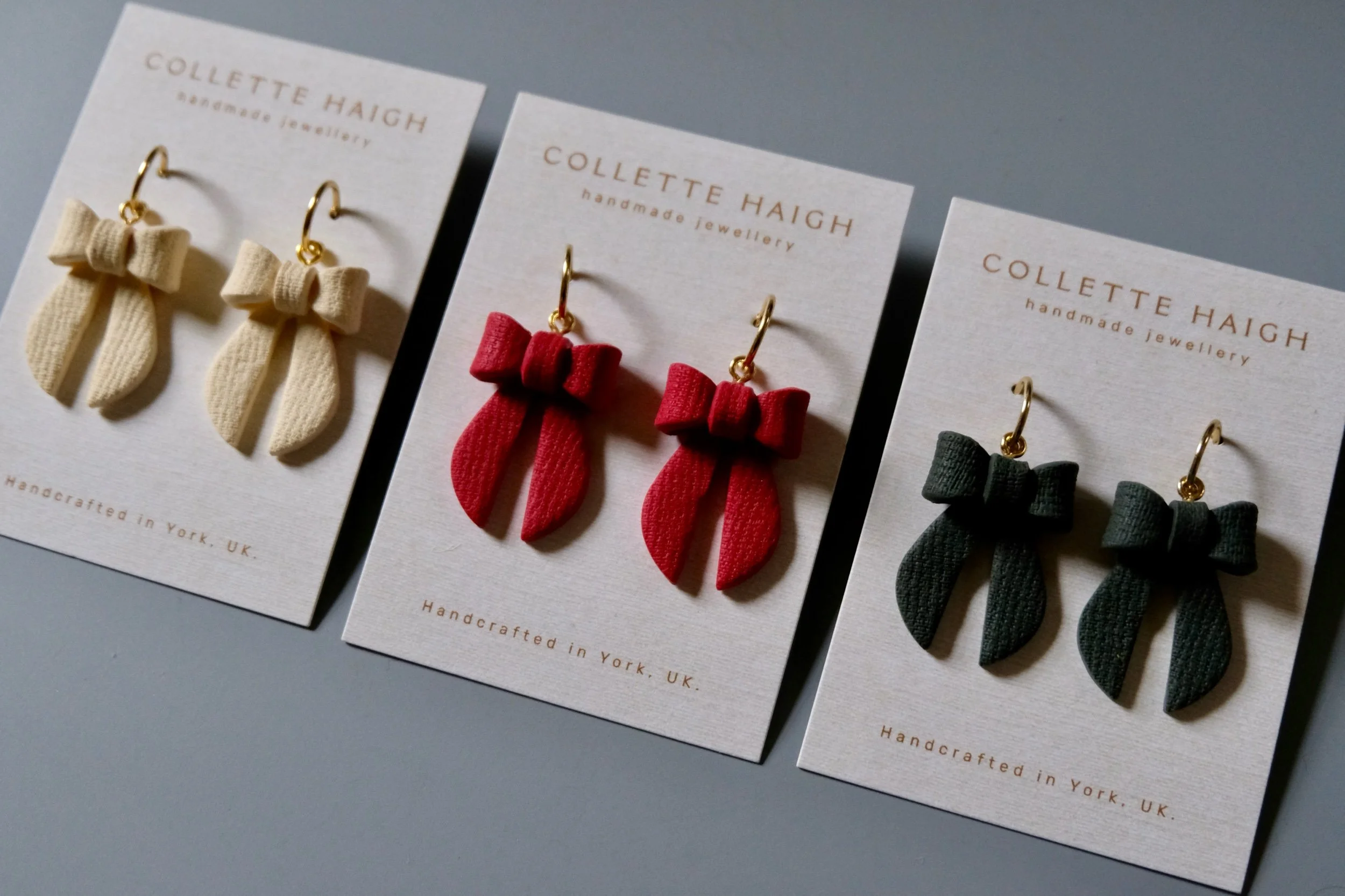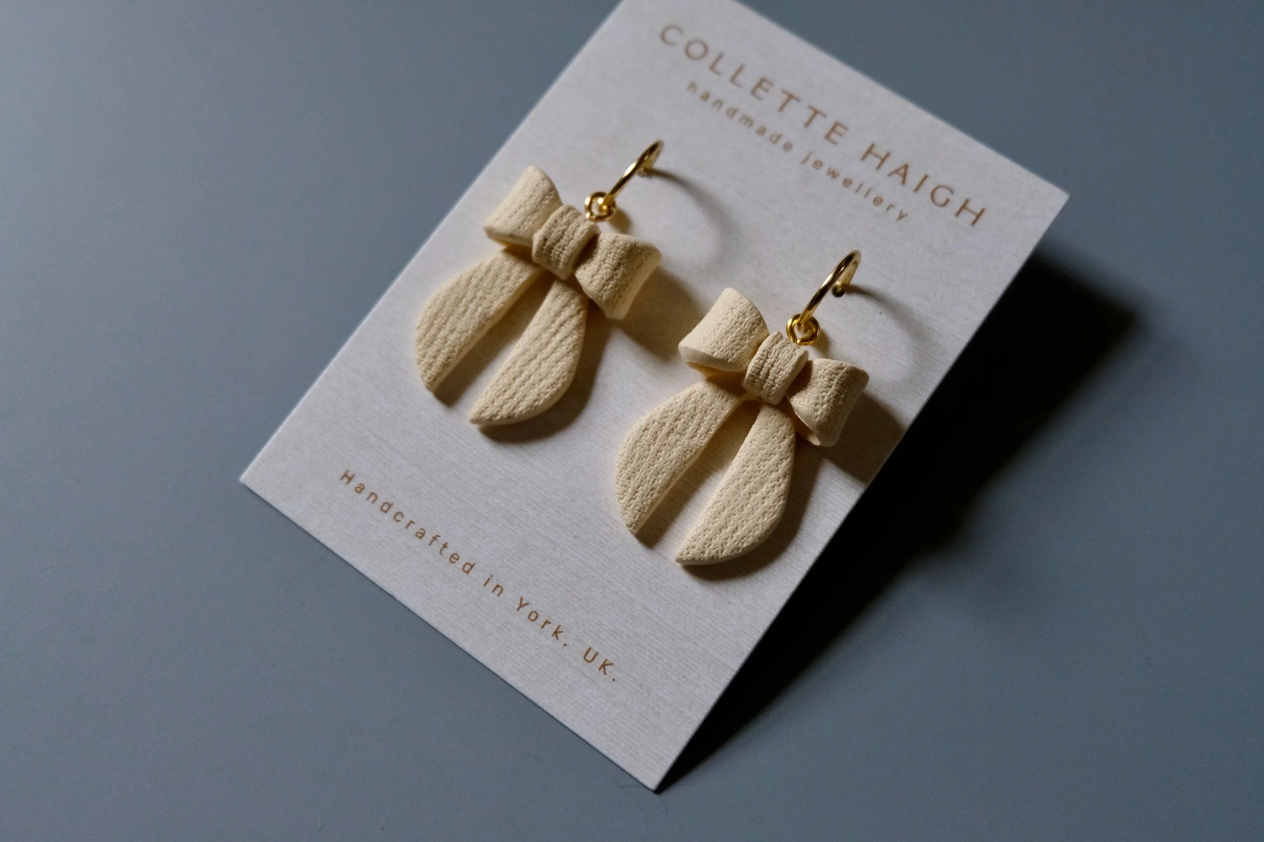 Each pair is made from polymer clay, ensuring durability and comfort for everyday wear. The bows are delicately shaped and securely attached via a ballpoint hoop, making them easy to wear.