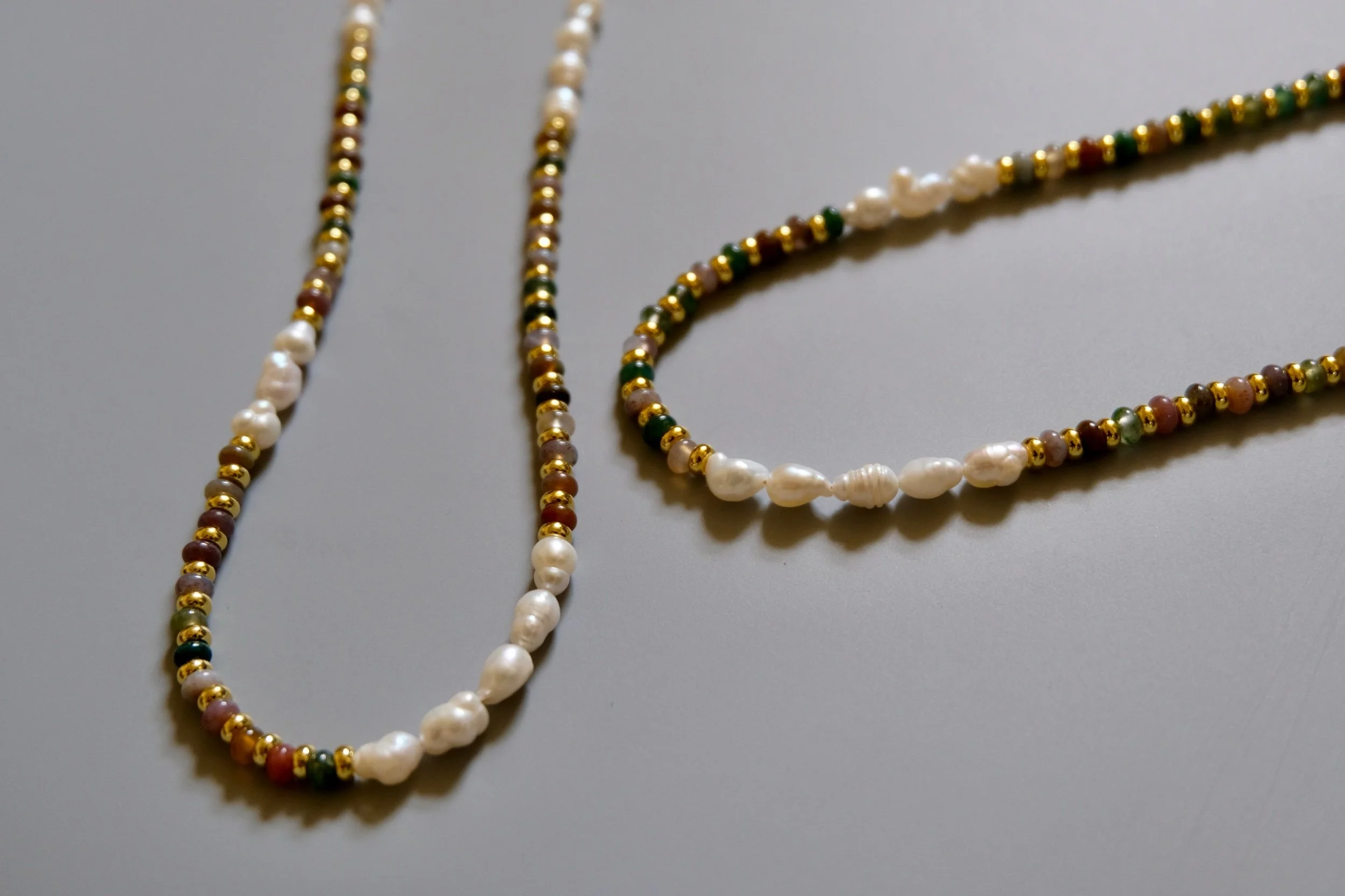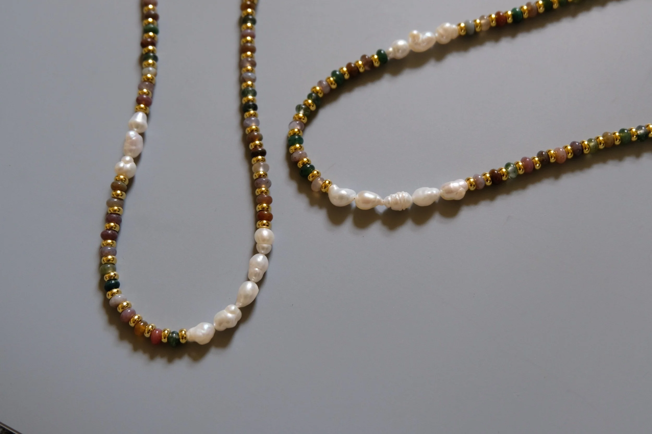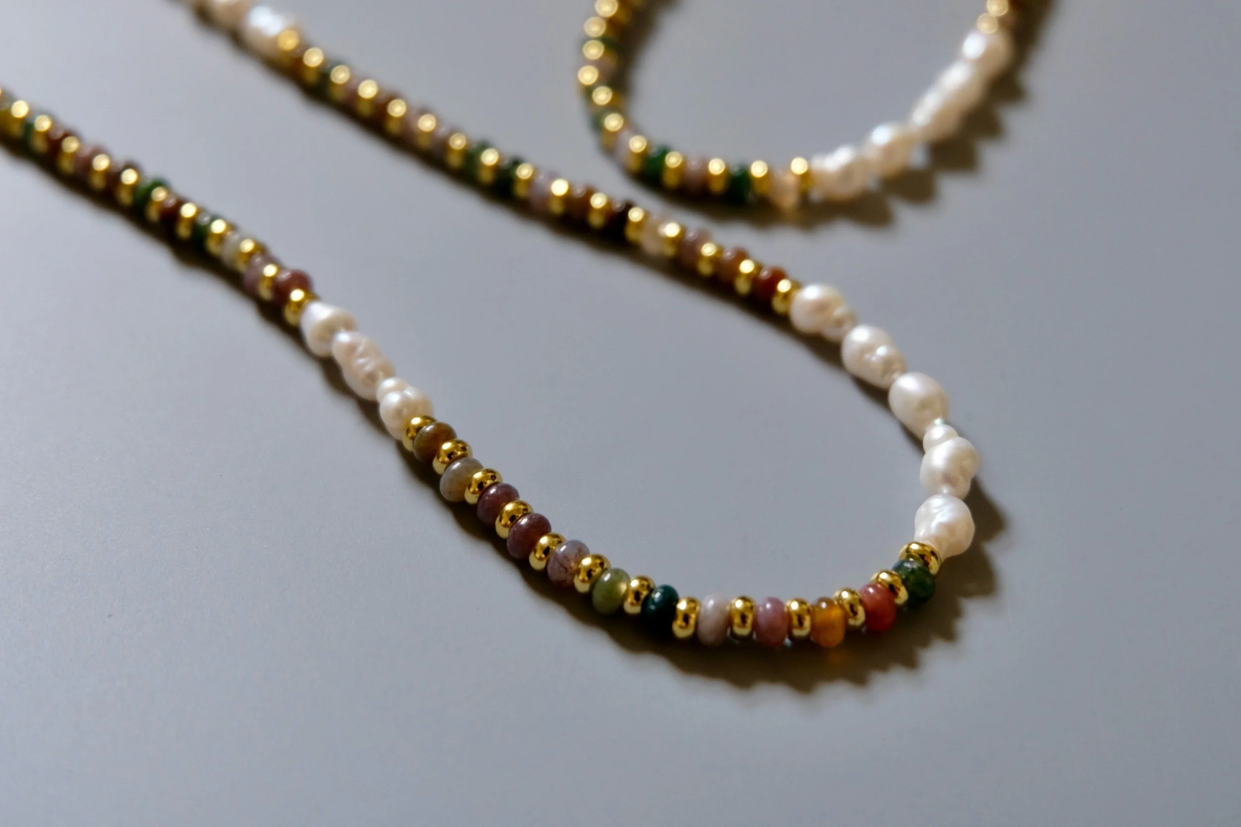 This beaded necklace is available in 3 colours and finished with an orange pendant charm